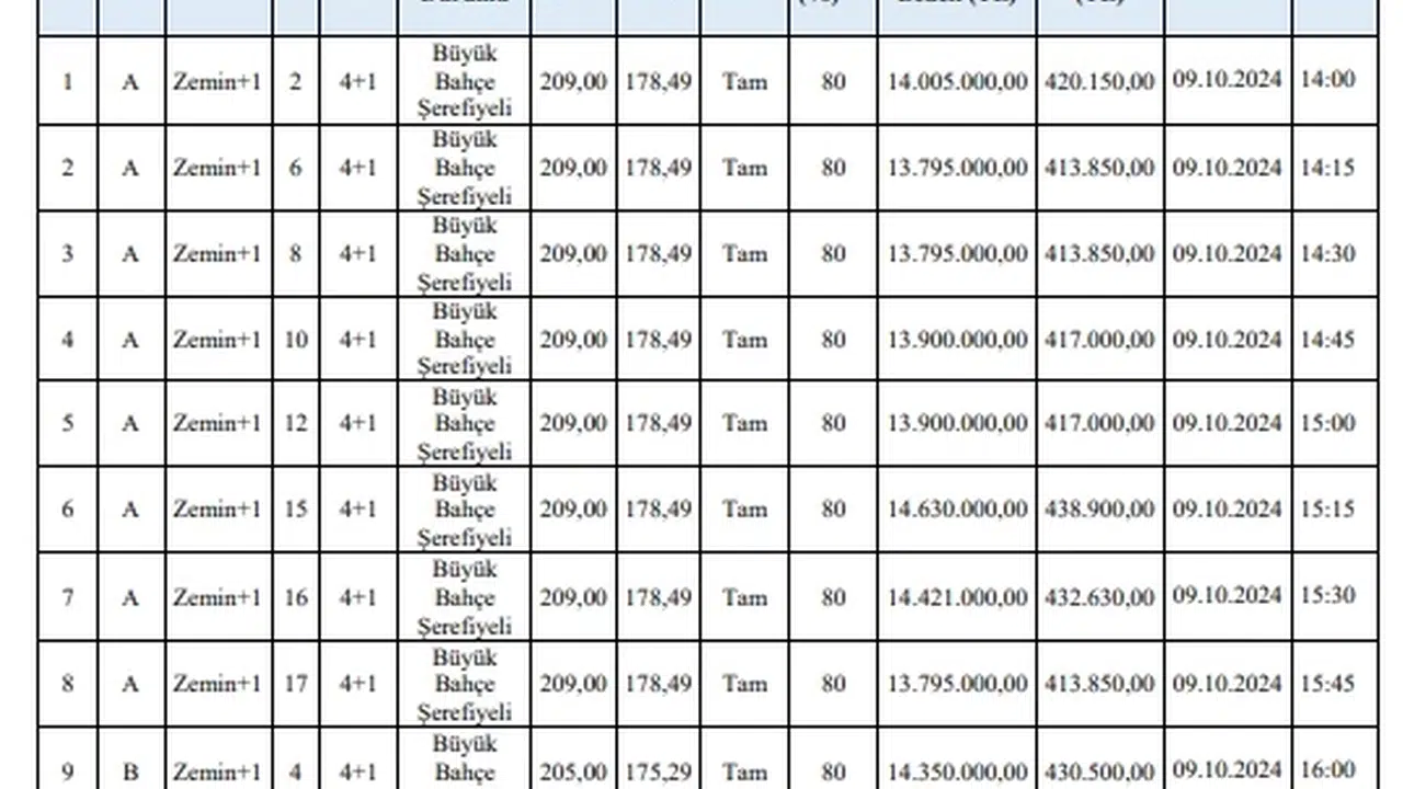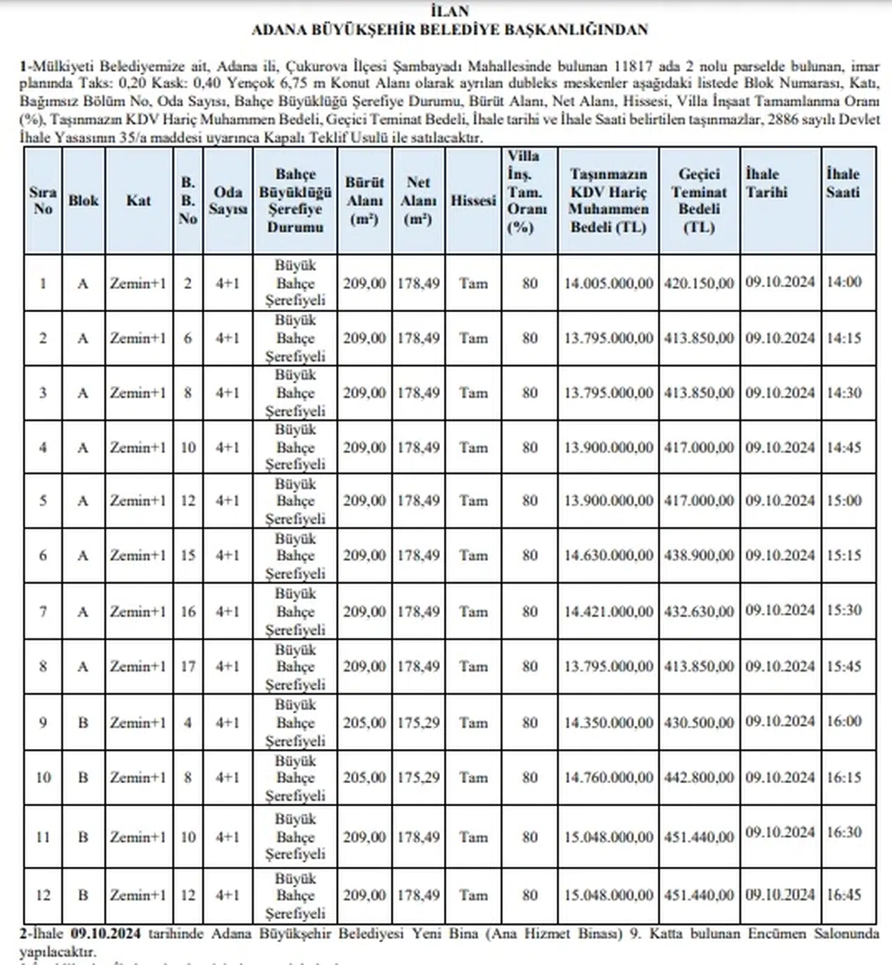 Çukurova ilçesi Şambayadı Mahallesinde bulunan 11817 ada 2 nolu parselde bulunan 12 adet dubleks mesken 9 Ekim'de kapalı teklif usulüyle satılacak. Satışa çıkarılan villalar, 6 Şubat depreminin ardından doğan konut ihtiyacı gerekçesi ile imara açılan Çukurova ilçesi Şambayadı Mahallesi'nde bulunuyor. Yeni Adana İmar İnşaat Ticaret A.Ş tarafından Büyükşehir Belediyesi'ne ait arazide 2023 yılı Ağustos ayında yapımına başlanan projede satışa çıkarılan 12 villayla birlikte toplamda 128 villa bulunuyor. (DHA)