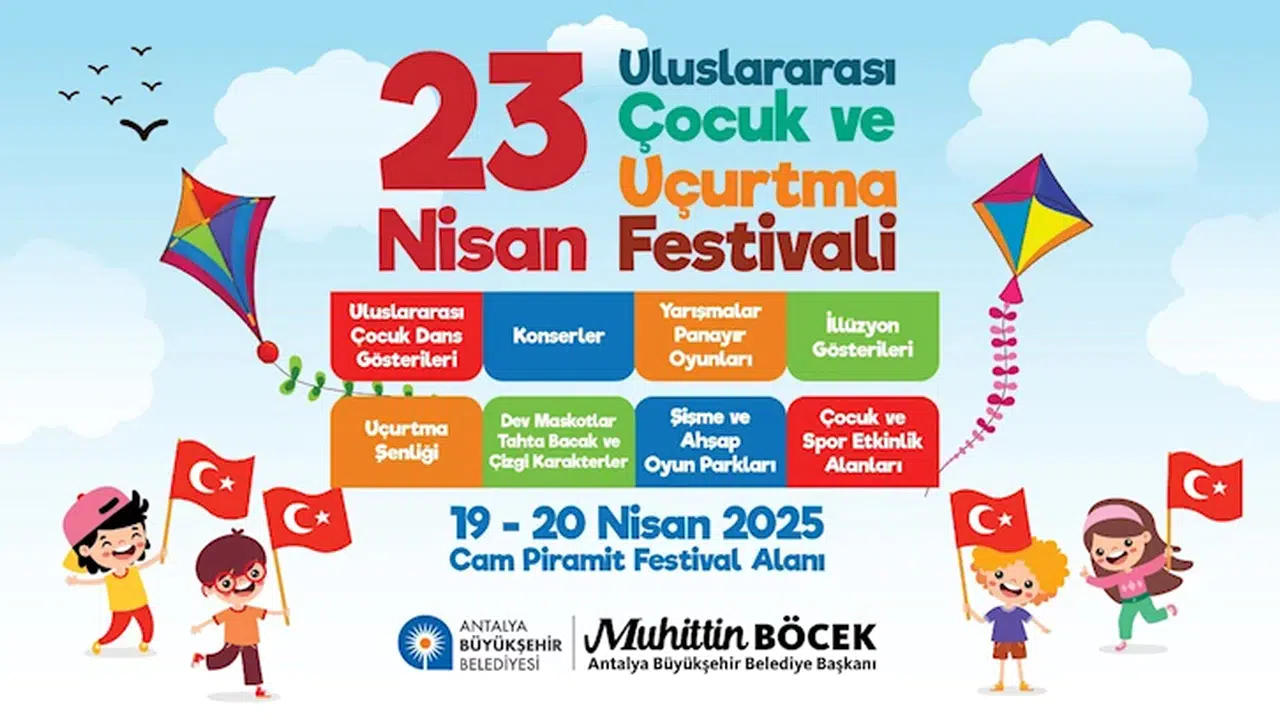 Antalyalı çocuklar, 23 Nisan Ulusal Egemenlik ve Çocuk Bayramı'nı Büyükşehir Belediyesi'nin düzenleyeceği Çocuk ve Uçurtma Festivali ile coşku içinde kutlayacak. Uluslararası Çocuk Festivali kapsamında, Antalya’ya gelen konuk ülke çocukları 19 Nisan Cumartesi ve 20 Nisan Pazar günü 16.30’da Cam Piramit Kral Yolu sahnesinde dans gösterileri yapacak. Konuk ülke çocukları, 21 Nisan Pazartesi günü 16.00’da Atatürk Parkı ile Cumhuriyet Meydanı arasında gerçekleşecek Sevgi Korteji’nin ardından 16.30’da Cumhuriyet Meydanı’nda yöresel danslarını sergileyecek.
