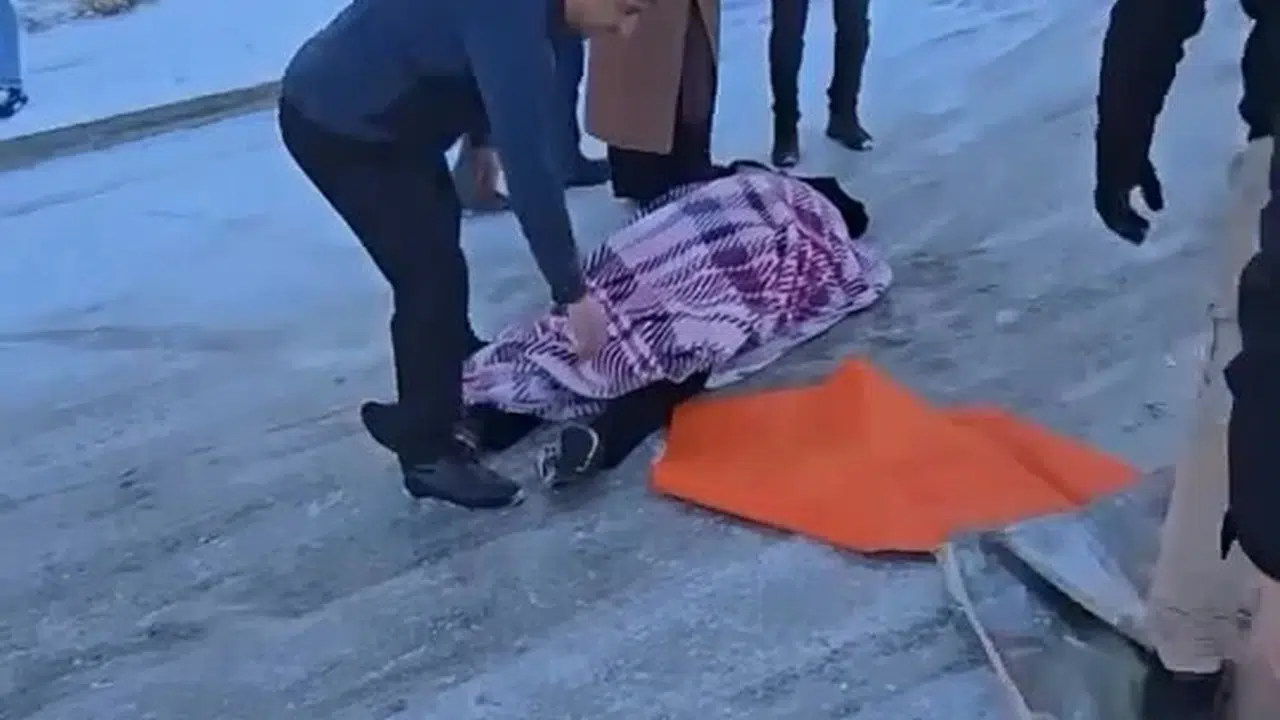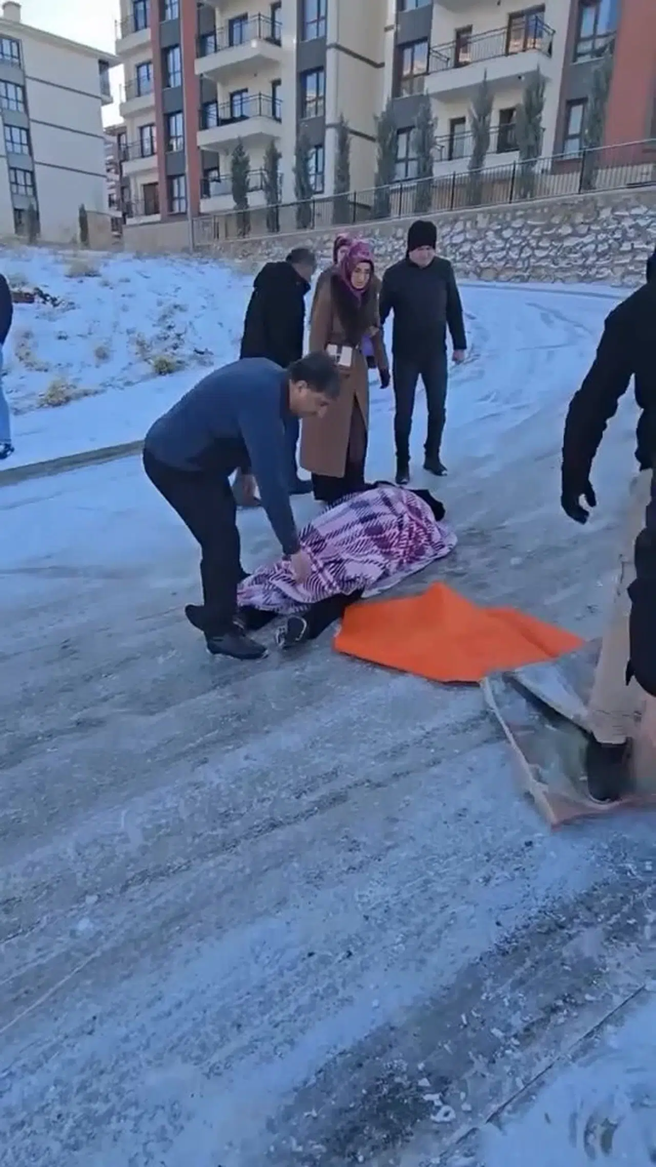 Tekin YALÇINKAYA/ELAZIĞ, (DHA)- ELAZIĞ’da buzlu yolda düşüp yaralanan kişiye, ekipler yere serdikleri kilim ve battaniyelerle ulaşarak müdahale etti. O anlar cep telefonu kamerasıyla kaydedildi.