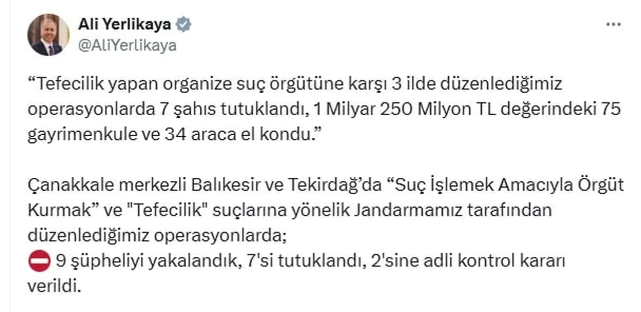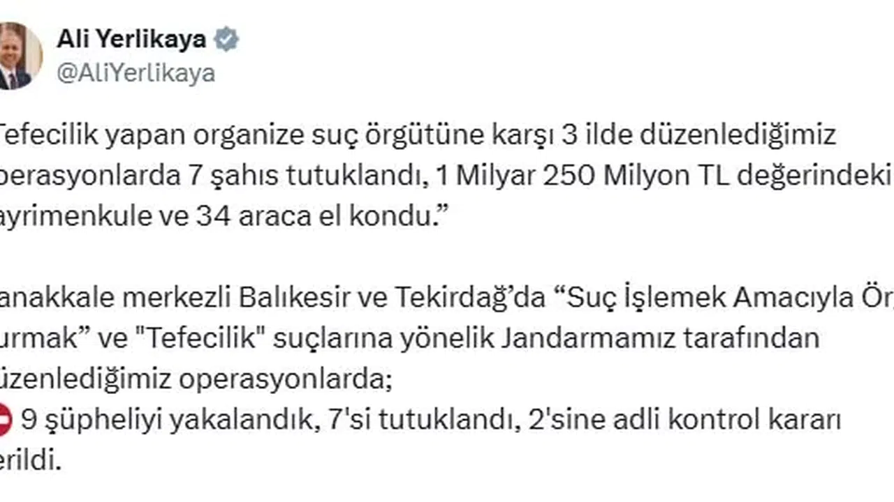 İçişleri Bakanı Ali Yerlikaya'nın sosyal medya hesabından yaptığı açıklamaya göre; Çanakkale Cumhuriyet Başsavcılığı ve Jandarma Genel Komutanlığı koordinesinde Çanakkale merkezli, Balıkesir ve Tekirdağ'da 'Suç işlemek amacıyla örgüt kurmak' ve 'Tefecilik' suçlarına yönelik operasyonlar düzenledi. 9 şüpheli yakalanırken, 2 bin 478 çek ve senet, 10 çek defteri ve çok sayıda bilgisayar, cep telefonu, muhtelif doküman ve dijital materyal ele geçirildi. Ayrıca 1 milyar 250 milyon TL değerindeki 75 gayrimenkule ve 34 taşıta el konuldu. Adliyeye sevk edilen şüphelilerden 7'si tutuklandı, 2'sine adli kontrol kararı verildi. Şüphelilerin; faizle borç verdikleri kişileri baskı altına aldıkları, yüksek faizle verdikleri paraların teminatı olarak çek, senet, tapu gibi belgeler imzalattıkları, ödeme yapamayanlara ait mal varlıklarını tehdit ve baskıyla aldıkları tespit edildi. (DHA)
