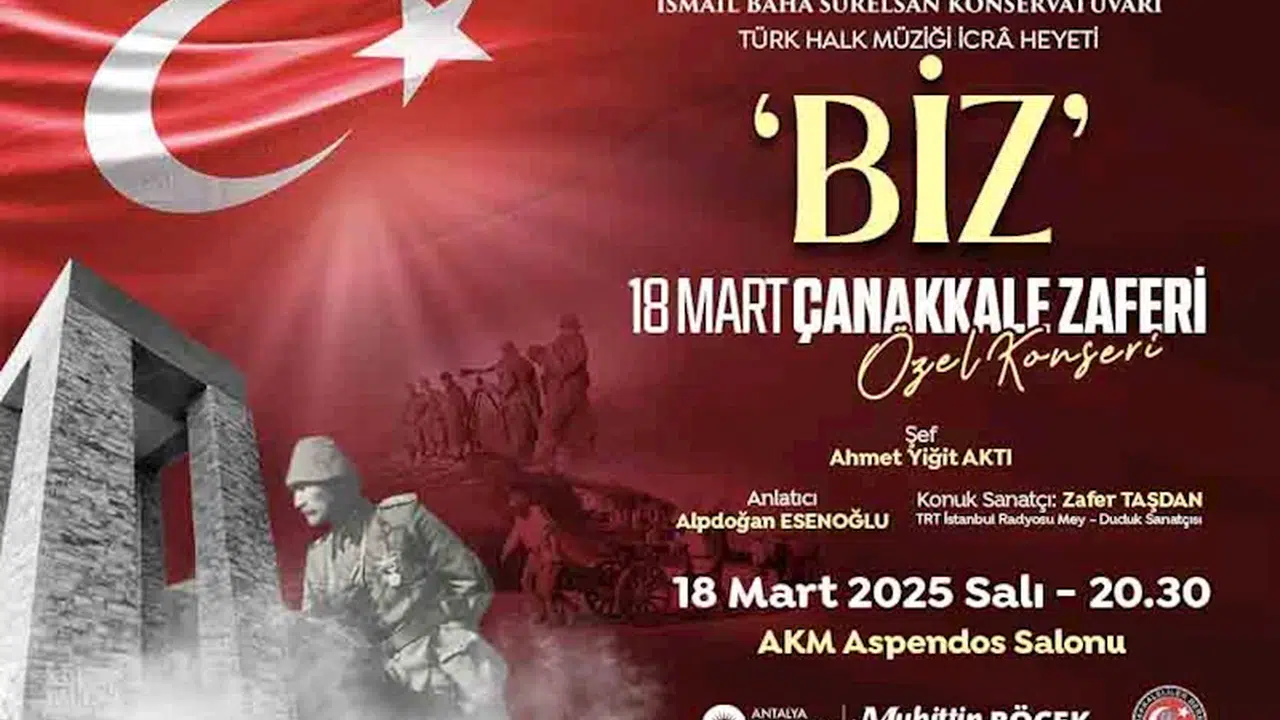 Antalya Büyükşehir Belediyesi İsmail Baha Sürelsan Konservatuvarı Türk Halk Müziği İcrâ Heyeti, Çanakkale Deniz Zaferi'nin 110. Yıl Dönümü ve Şehitleri Anma Günü'nde anlamlı bir konser düzenliyor. Şef Yiğit Aktı yönetiminde gerçekleşecek 'Biz' adlı özel program 18 Mart Salı günü saat 20.30'da Atatürk Kültür Merkezi Aspendos Salonunda izleyiciyle buluşacak. TRT İstanbul radyosu mey-duduk sanatçısı Zafer Taşdan'ın konuk olarak katılacağı konser programı Alpdoğan Esenoğlu'nun anlatımıyla gerçekleşecek. (DHA)