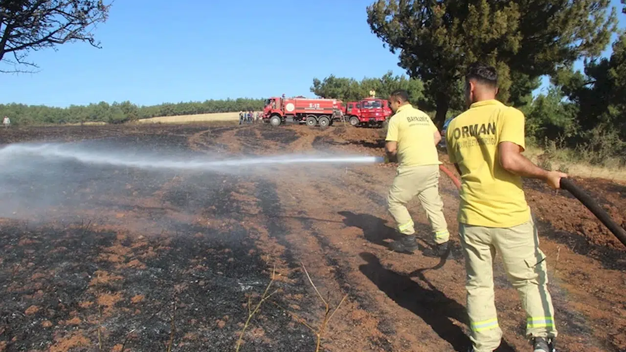 Fatih DALDAL/ ÇANAKKALE, (DHA)- ÇANAKKALE'nin Bayramiç ilçesindeki tarım arazisinde yangın çıktı. Alevler havadan ve karadan müdahaleyle 1,5 saatte söndürülürken, 100 dönüm alanın zarar gördüğü belirtildi.