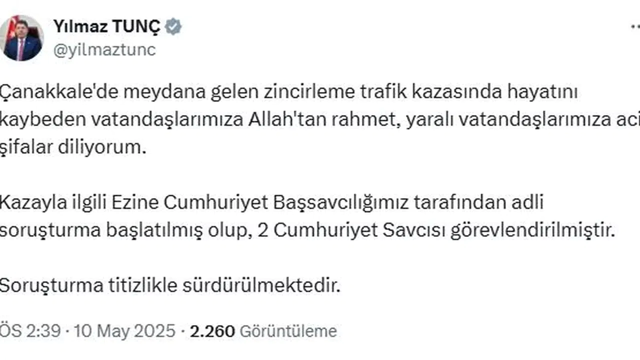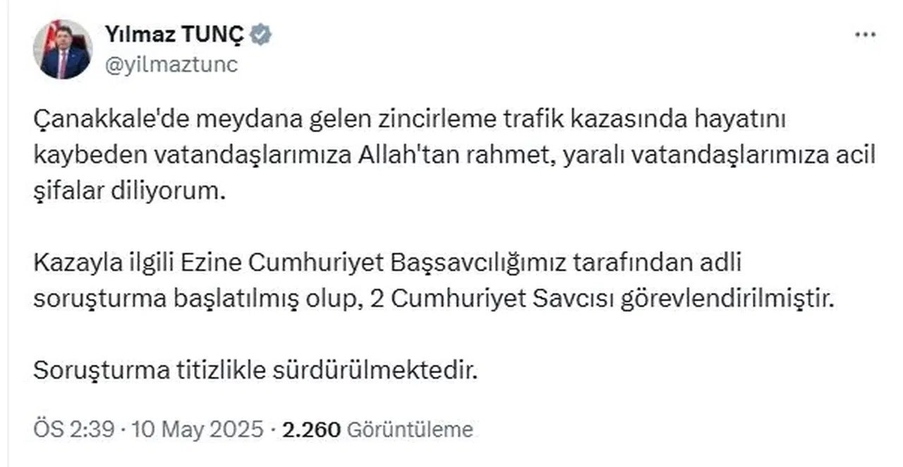 Adalet Bakanı Yılmaz Tunç, Çanakkale'de meydana gelen zincirleme trafik kazasına ilişkin sosyal medya hesabından açıklama yaptı. Bakan Tunç, "Çanakkale'de meydana gelen zincirleme trafik kazasında hayatını kaybeden vatandaşlarımıza Allah'tan rahmet, yaralı vatandaşlarımıza acil şifalar diliyorum. Kazayla ilgili Ezine Cumhuriyet Başsavcılığımız tarafından adli soruşturma başlatılmış olup, 2 Cumhuriyet savcısı görevlendirilmiştir. Soruşturma titizlikle sürdürülmektedir" dedi. (DHA)