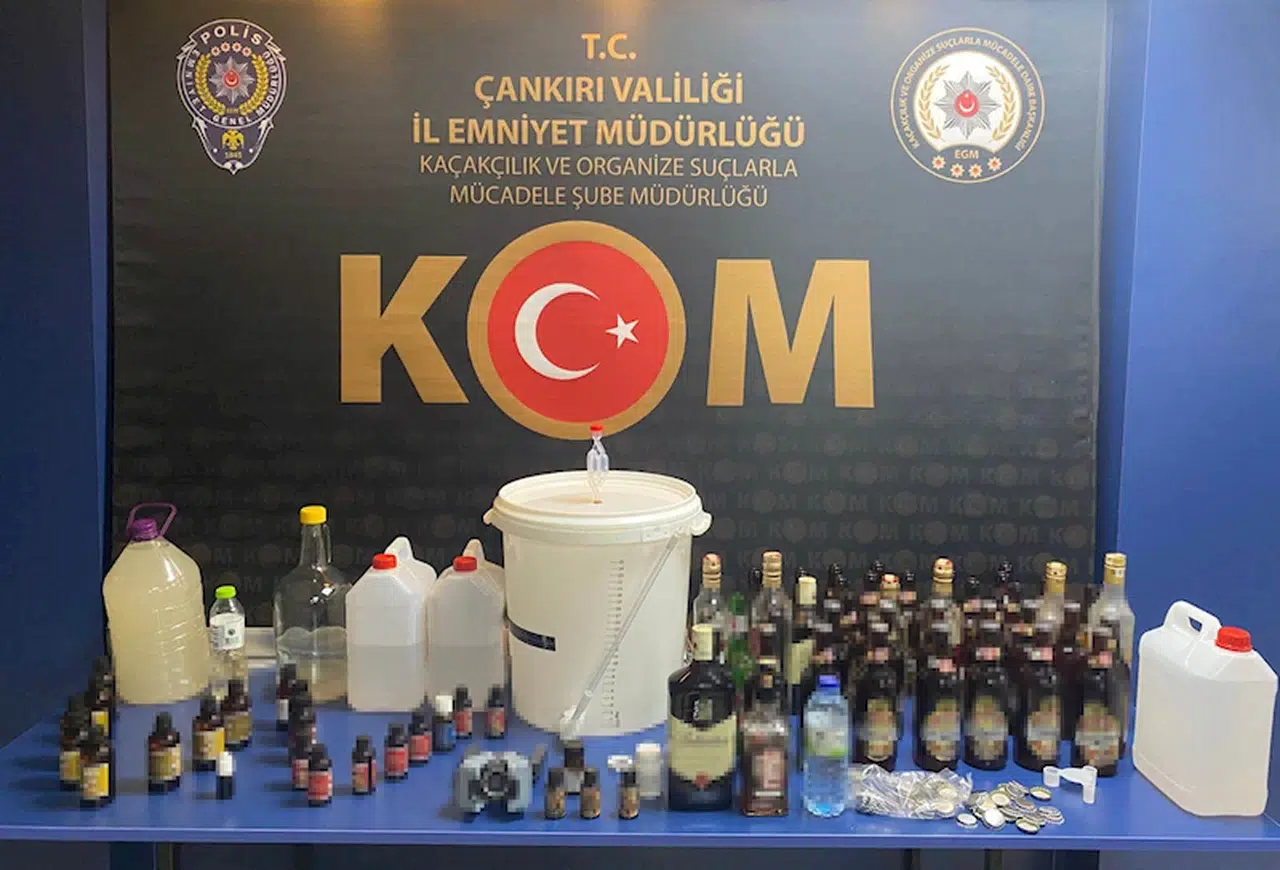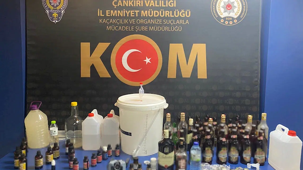 İl Emniyet Müdürlüğü Kaçakçılık ve Organize Suçlarla Mücadele Şubesi ekipleri, sahte içkiyle mücadele kapsamında, kent merkezi ve Eldivan ilçesindeki birçok adrese eş zamanlı operasyon düzenledi, 5 şüpheli gözaltına alındı. Şüphelilerin adreslerindeki aramalarda 50 litre sahte içki, 23 aroma kiti, 27 doluma hazır şişe, 50 kullanılmamış metal şişe kapağı, 2 maya kovası temizleme sıvısı, 1 şişe açma aparatı, 1 hava kilidi ve 1 aktarma çubuğu ele geçirildi. (DHA)