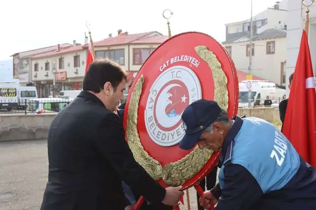 Hükümet Konağı tören alanında gerçekleştirilen çelenk sunma ve anma programına, Çat Kaymakamı Muhammet Serdar Erdoğan, İlçe protokolü, öğretmenler ve öğrenciler yoğun bir katılım gösterdi.