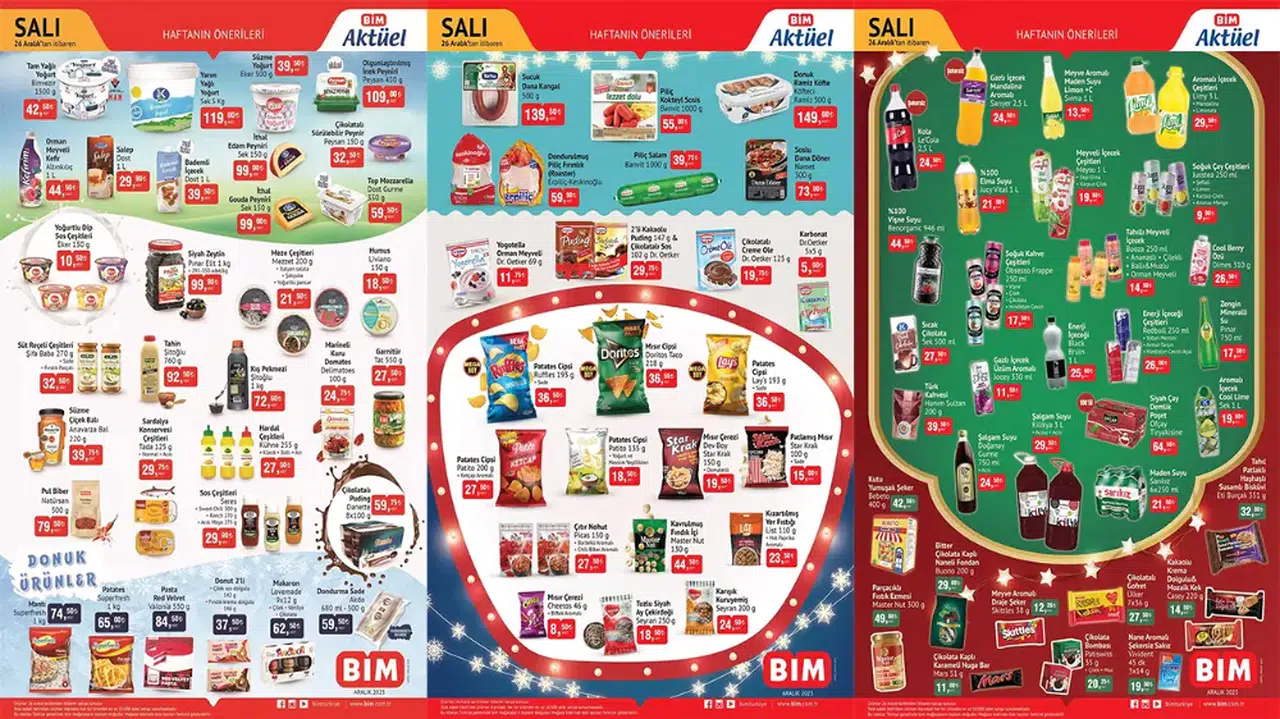 Nane aromalı şekersiz sakız, çikolata bombası, kutu yumuşak şeker, şalgam suyu, maden suyu, Türk kahvesi, sıcak çikolata, soğuk kahve çeşitleri, vişne suyu, kola, gazlı içecek mandalina aromalı ve siyah çay demlik poşet gibi ürünlerin yer aldığı 26 Aralık tarihinden itibaren geçerli olacak BİM kataloğu yayınlandı.