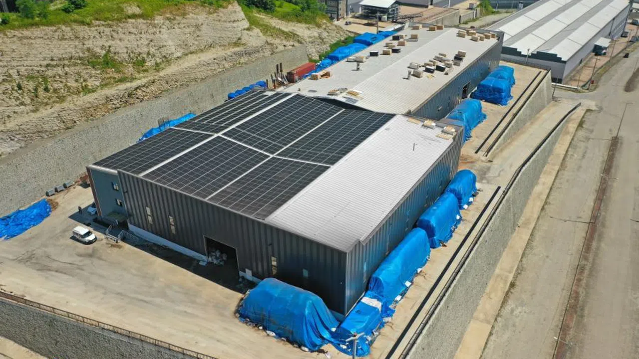 Rize Belediyesi’nin Kalkandere Organize Sanayi Bölgesinde hayata geçirdiği Çay Çöpünden Mangal Kömürü Üretim tesisinin çatısına güneş enerjisi panelleri yerleştiriliyor.