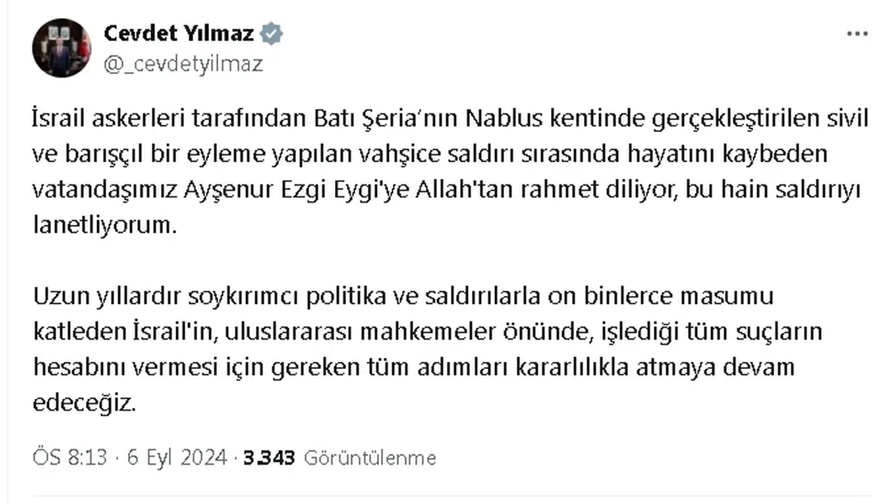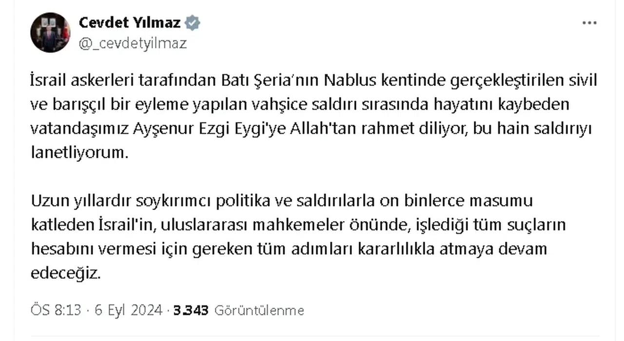 Cumhurbaşkanı Yardımcısı Yılmaz, sosyal medya hesabından yaptığı paylaşımda, "İsrail askerleri tarafından Batı Şeria’nın Nablus kentinde gerçekleştirilen sivil ve barışçıl bir eyleme yapılan vahşice saldırı sırasında hayatını kaybeden vatandaşımız Ayşenur Ezgi Eygi'ye Allah'tan rahmet diliyor, bu hain saldırıyı lanetliyorum. Uzun yıllardır soykırımcı politika ve saldırılarla on binlerce masumu katleden İsrail'in, uluslararası mahkemeler önünde, işlediği tüm suçların hesabını vermesi için gereken tüm adımları kararlılıkla atmaya devam edeceğiz" dedi. (DHA)