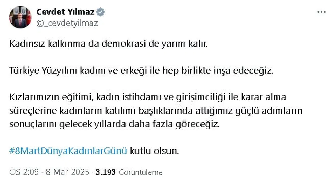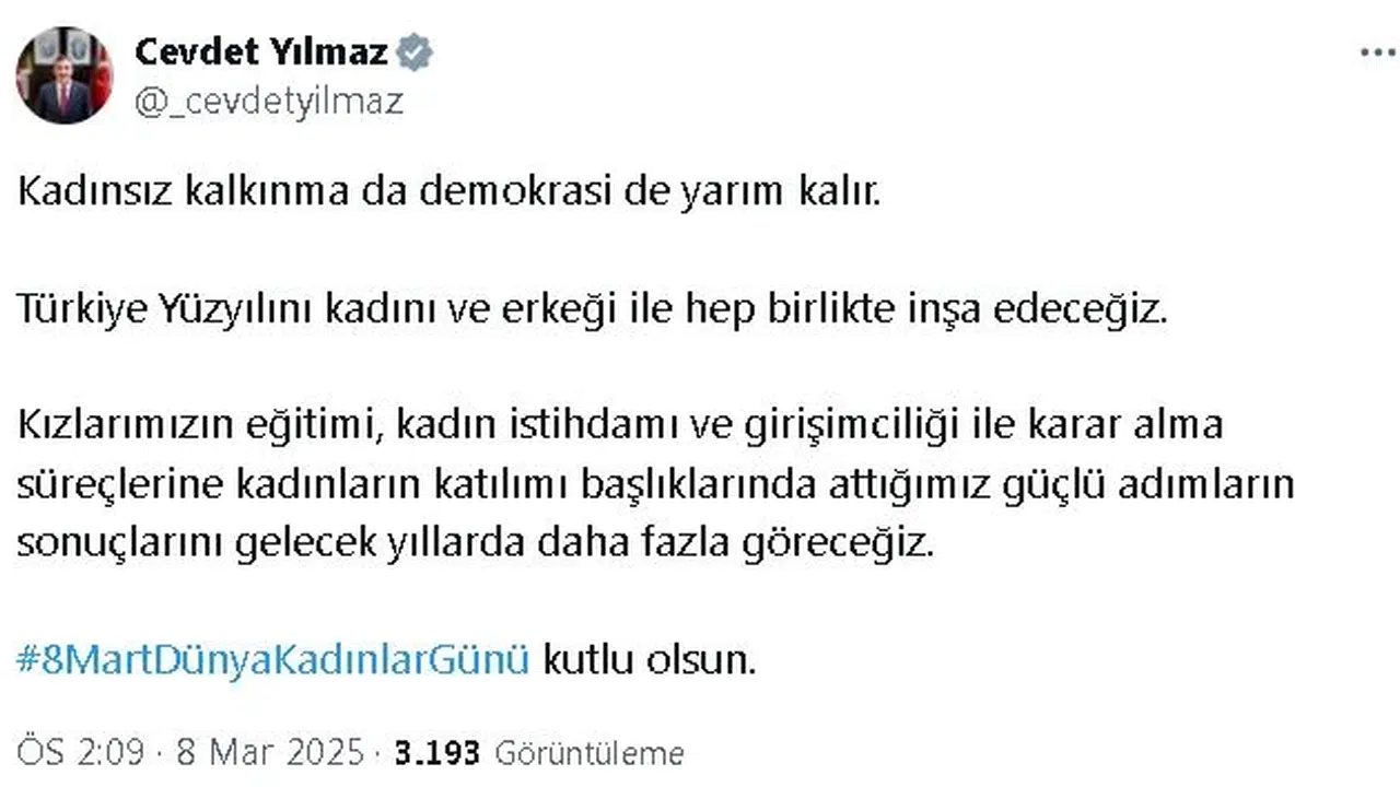 Cumhurbaşkanı Yardımcısı Cevdet Yılmaz, 8 Mart Dünya Kadınlar Günü dolayısıyla sosyal medya hesabından paylaştığı mesajında, "Kadınsız kalkınma da demokrasi de yarım kalır. 'Türkiye Yüzyılı'nı kadını ve erkeği ile hep birlikte inşa edeceğiz. Kızlarımızın eğitimi, kadın istihdamı ve girişimciliği ile karar alma süreçlerine kadınların katılımı başlıklarında attığımız güçlü adımların sonuçlarını gelecek yıllarda daha fazla göreceğiz. 8 Mart Dünya Kadınlar Günü kutlu olsun" dedi. (DHA)