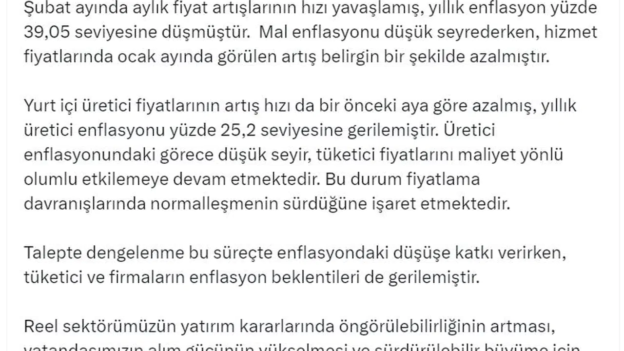 Cumhurbaşkanı Yardımcısı Yılmaz, Türkiye İstatistik Kurumu'nun (TÜİK) açıkladığı şubat ayı enflasyon verilene ilişkin değerlendirmede bulundu. Yılmaz, "Dezenflasyon sürecinde kararlılıkla uyguladığımız politikalar neticesinde enflasyon düşmeye devam ediyor. Şubat ayında aylık fiyat artışlarının hızı yavaşlamış, yıllık enflasyon yüzde 39,05 seviyesine düşmüştür. Mal enflasyonu düşük seyrederken, hizmet fiyatlarında ocak ayında görülen artış belirgin bir şekilde azalmıştır. Yurt içi üretici fiyatlarının artış hızı da bir önceki aya göre azalmış, yıllık üretici enflasyonu yüzde 25,2 seviyesine gerilemiştir" dedi.