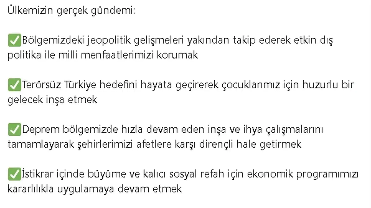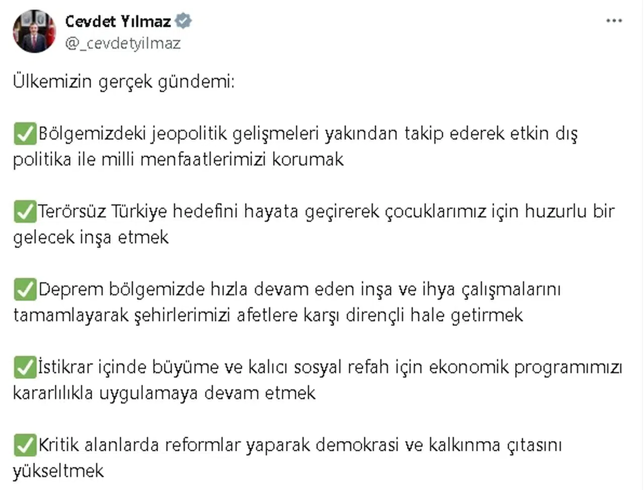 Cumhurbaşkanı Yardımcısı Cevdet Yılmaz, sosyal medya hesabından yaptığı açıklamada, "Ülkemizin gerçek gündemi; bölgemizdeki jeopolitik gelişmeleri yakından takip ederek etkin dış politika ile milli menfaatlerimizi korumak, 'Terörsüz Türkiye' hedefini hayata geçirerek çocuklarımız için huzurlu bir gelecek inşa etmek, deprem bölgemizde hızla devam eden inşa ve ihya çalışmalarını tamamlayarak şehirlerimizi afetlere karşı dirençli hale getirmek, istikrar içinde büyüme ve kalıcı sosyal refah için ekonomik programımızı kararlılıkla uygulamaya devam etmek, kritik alanlarda reformlar yaparak demokrasi ve kalkınma çıtasını yükseltmek" dedi. (DHA)