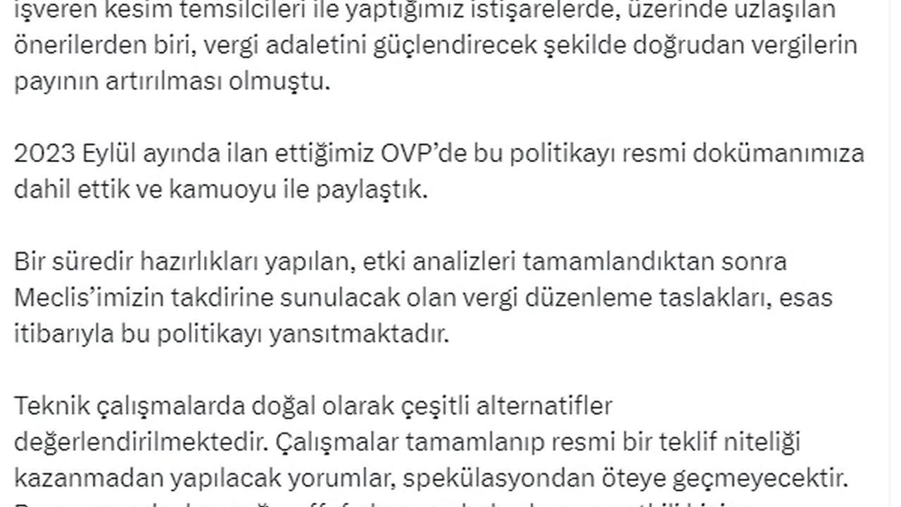 Cumhurbaşkanı Yardımcısı Yılmaz, güncel ekonomik konular ile Hazine ve Maliye Bakanlığı'nın kayıt dışılıkla mücadele faaliyetlerini yasal düzenlemelerle güçlendirmek için hazırladığı vergi paketine yönelik oluşan spekülasyonlara ilişkin sosyal medya hesabından açıklama yaptı. Yılmaz, geçen yıl Orta Vadeli Program'ın (OVP) hazırlık sürecinde; çalışan ve işveren temsilcileri ile yapılan istişareler sonucunda vergi adaletini güçlendirmek için doğrudan vergi paylarının artırılması konusunda uzlaşma sağlandığını hatırlatarak, "2023 Eylül ayında ilan ettiğimiz OVP'de bu politikayı resmi dokümanımıza dahil ettik ve kamuoyu ile paylaştık. Bir süredir hazırlıkları yapılan, etki analizleri tamamlandıktan sonra Meclisimizin takdirine sunulacak olan vergi düzenleme taslakları, esas itibarıyla bu politikayı yansıtmaktadır. Teknik çalışmalarda doğal olarak çeşitli alternatifler değerlendirilmektedir. Çalışmalar tamamlanıp resmi bir teklif niteliği kazanmadan yapılacak yorumlar, spekülasyondan öteye geçmeyecektir. Bu çerçevede, kaynağı şeffaf olmayan haberlere ve yetkili kişi ve kurumlar dışında yapılan paylaşımlara itibar edilmemelidir. Etki değerlendirmede temel çerçevemiz; vergide adaleti artırırken enflasyonist yan etki oluşturmamak, gelir dağılımını gözetmek, yatırım, istihdam, üretim ve ihracatı korumaktır. Harcama ve gelir tedbirleriyle mali dengelerde sağlanacak iyileşme, haziran ayı ile başlayacak dezenflasyon dönemini destekleyecek, yıllık bazda trilyon Türk Lirası düzeyinde seyreden deprem harcamaları başta olmak üzere, kamu harcamalarını sağlıklı kaynaklarla finanse etme imkanı sunacaktır. Böylece, kamunun borçlanma ihtiyacı ve faiz giderleri de azaltılmış olacaktır" ifadelerini kullandı.