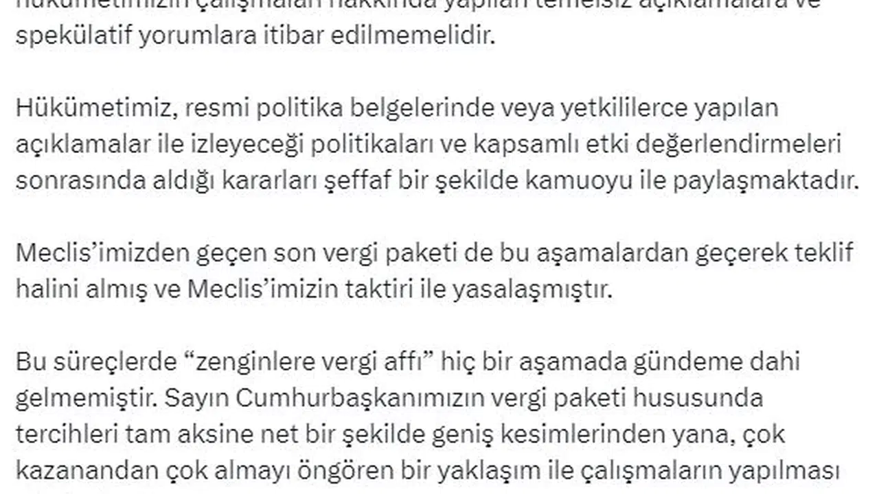 Cumhurbaşkanı Yardımcısı Yılmaz, sosyal medya hesabından yaptığı açıklamada, "Medya ve sosyal medyada isim ve kaynak ortaya konmadan hükümetimizin çalışmaları hakkında yapılan temelsiz açıklamalara ve spekülatif yorumlara itibar edilmemelidir. Hükümetimiz, resmi politika belgelerinde veya yetkililerce yapılan açıklamalar ile izleyeceği politikaları ve kapsamlı etki değerlendirmeleri sonrasında aldığı kararları şeffaf bir şekilde kamuoyu ile paylaşmaktadır. Meclisimizden geçen son vergi paketi de bu aşamalardan geçerek teklif halini almış ve Meclisimizin takdiri ile yasalaşmıştır. Bu süreçlerde, zenginlere vergi affı hiçbir aşamada gündeme dahi gelmemiştir. Sayın Cumhurbaşkanımızın vergi paketi hususunda tercihleri tam aksine net bir şekilde geniş kesimlerinden yana, çok kazanandan çok almayı öngören bir yaklaşım ile çalışmaların yapılması yönünde olmuştur. Aziz milletimiz Sayın Cumhurbaşkanımızı da bu yalanları yaymaya çalışanları da gayet iyi tanımaktadır" dedi. (DHA)