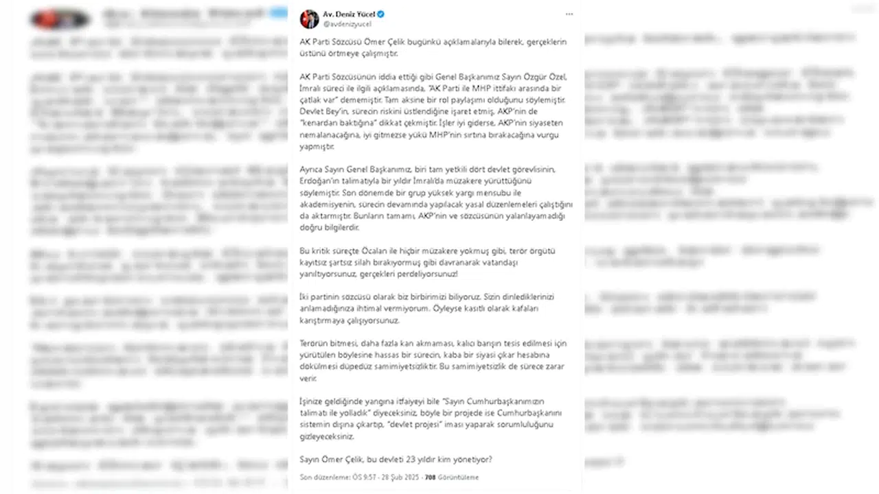 CHP Genel Başkan Yardımcısı ve Parti Sözcüsü Deniz Yücel, sosyal medya hesabından paylaşım yaparak, AK Parti Sözcüsü Ömer Çelik'in bugünkü açıklamalarına yönelik değerlendirmelerde bulundu. Yücel, paylaşımında, "AK Parti Sözcüsünün iddia ettiği gibi Genel Başkanımız Sayın Özgür Özel, İmralı süreci ile ilgili açıklamasında, 'AK Parti ile MHP ittifakı arasında bir çatlak var' dememiştir. Tam aksine bir rol paylaşımı olduğunu söylemiştir. Devlet Bey’in, sürecin riskini üstlendiğine işaret etmiş, AKP’nin de 'kenardan baktığına' dikkat çekmiştir. İşler iyi giderse, AKP’nin siyaseten nemalanacağına, iyi gitmezse yükü MHP’nin sırtına bırakacağına vurgu yapmıştır. Ayrıca Sayın Genel Başkanımız, biri tam yetkili dört devlet görevlisinin, Erdoğan’ın talimatıyla bir yıldır İmralı’da müzakere yürüttüğünü söylemiştir. Son dönemde bir grup yüksek yargı mensubu ile akademisyenin, sürecin devamında yapılacak yasal düzenlemeleri çalıştığını da aktarmıştır. Bunların tamamı, AKP’nin ve sözcüsünün yalanlayamadığı doğru bilgilerdir" ifadelerinin kullandı.