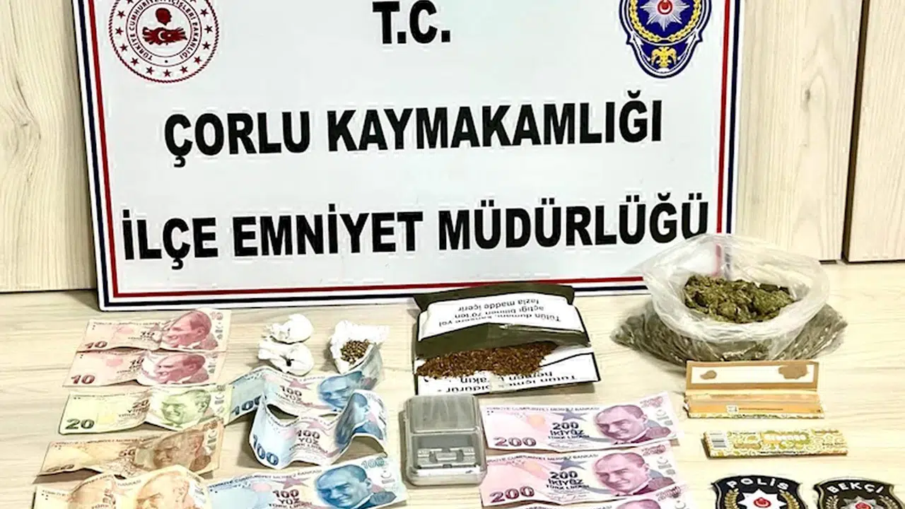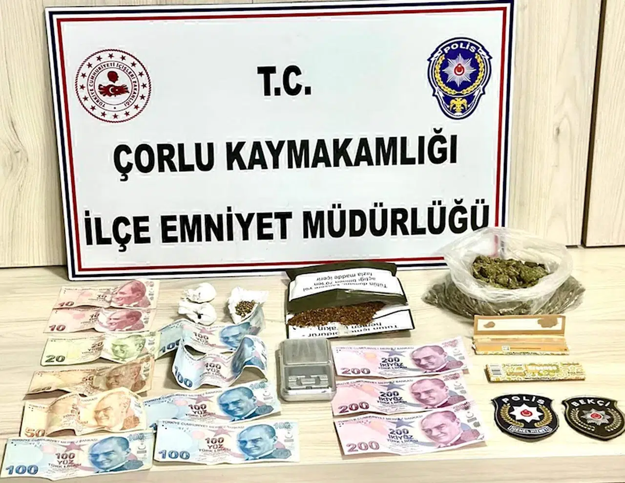 Çorlu İlçe Emniyet Müdürlüğü Şehit Sabahattin Ergin Polis Merkezi Amirliği'ne bağlı polis ve bekçi ekipleri ortaklaşa yürüttükleri çalışmalarda, durumundan şüphelendikleri H.İ.B., O.Ş. ve Y.A.A.'yı durdurup üst araması yaptı. Aramada, 2 gram esrar, 2 uyuşturucu sarma kağıdı ve 1240 lira ele geçirildi. Genişletilen çalışmada şüphelilerin uyuşturucuları para karşılığında M.Y.'den aldıkları belirlendi. Gözaltına alınan M.Y.'nin evinde yapılan aramada 92 gram esrar, 2 gram kenevir tohumu, uyuşturucu madde imalat ve satışında kullanılan hassas terazi ve benzeri malzemeler ele geçirildi. Emniyetteki işlemlerinin ardından adliyeye sevk edilen M.Y., çıkarıldığı mahkemede 'Uyuşturucu veya uyarıcı madde imal ve ticareti' suçundan tutuklandı. Diğer 3 şüpheli serbest bırakıldı. (DHA)