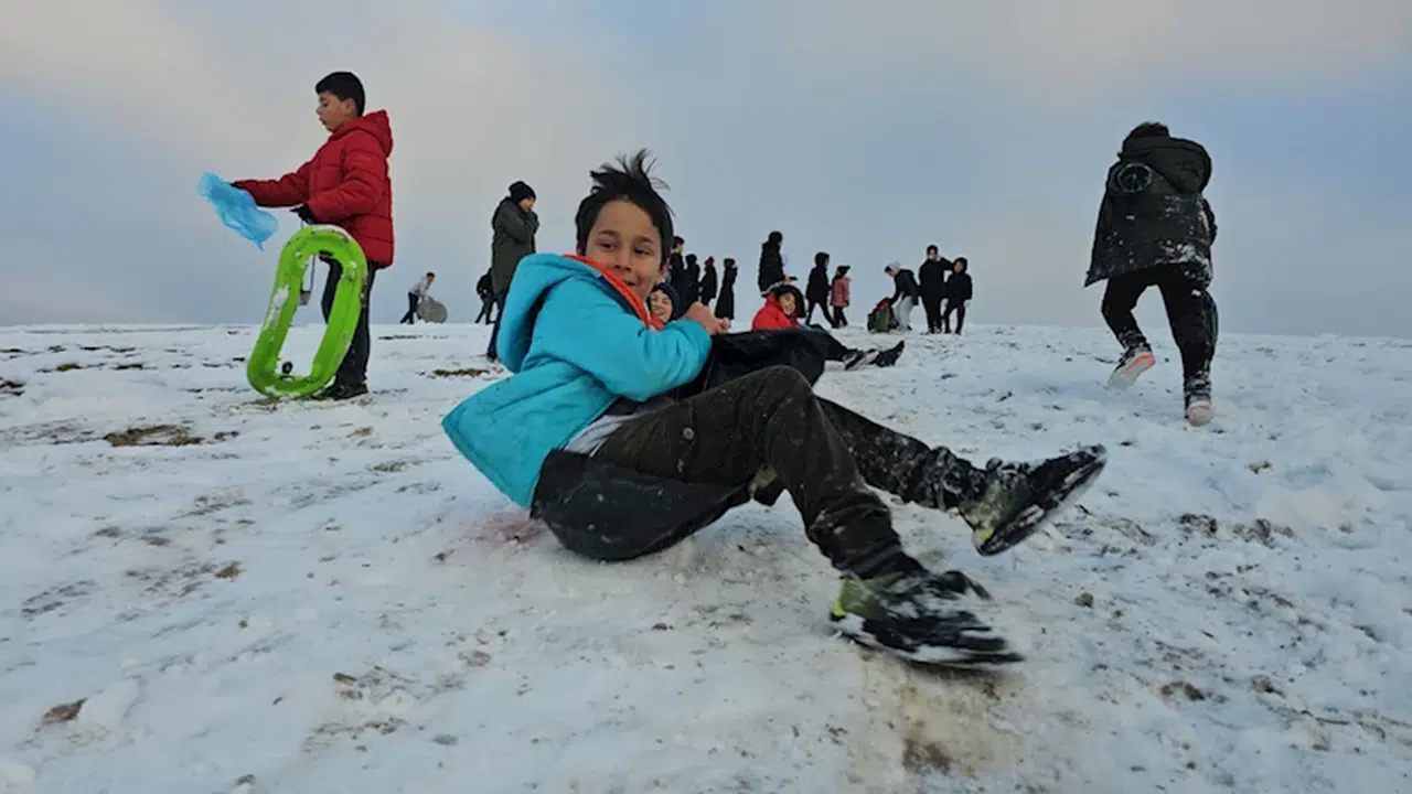 Çorum’da çocuklar tepsi ve plastik bidonlarla kayarak eğlendi