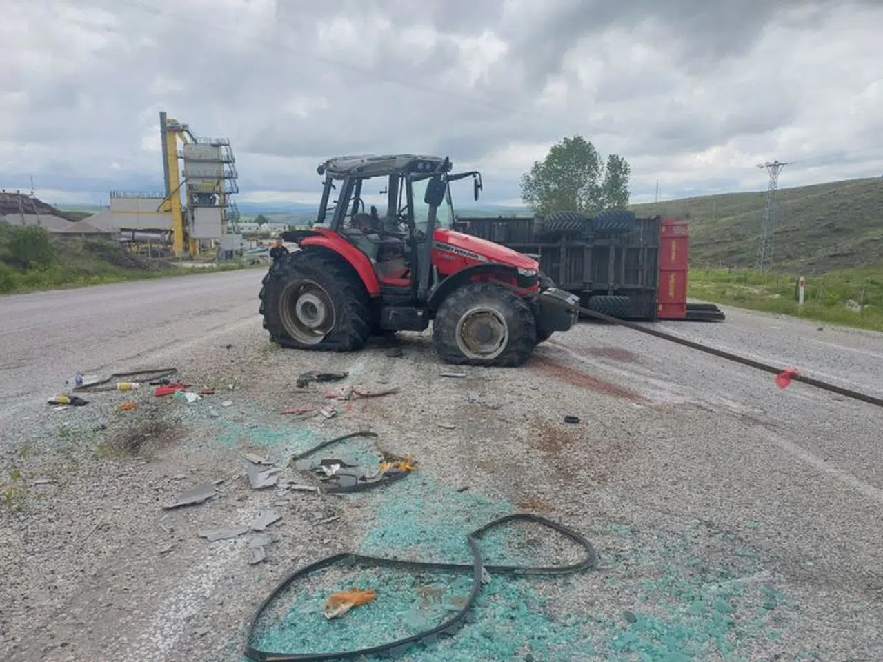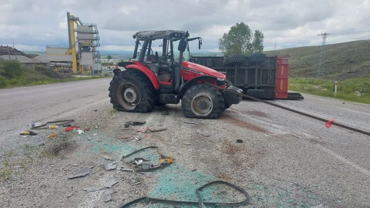 Devrilen traktörün kasasındaki demir profillerin yola saçılması nedeniyle Çorum-Yozgat kara yolunda ulaşımda aksama yaşandı.