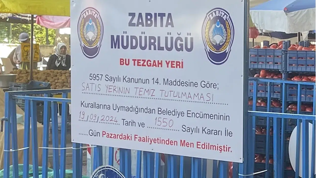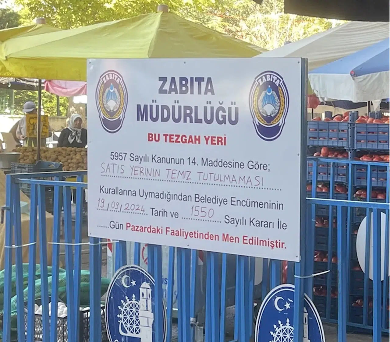 Esnafın tezgahının bulunduğu alan ise zabıta ekiplerince demir parmaklıklarla kapatılarak, üzerinde "Bu tezgah yeri, 5957 sayılı kanununun 14. maddesine göre, 'satış yerinin temiz tutulmaması' kuralına uymadığından, Belediye Encümeninin 19 Eylül 2024 tarih ve 1550 sayılı kararı ile 7 gün pazardaki faaliyetinden men edilmiştir." yazılı tabela asıldı.