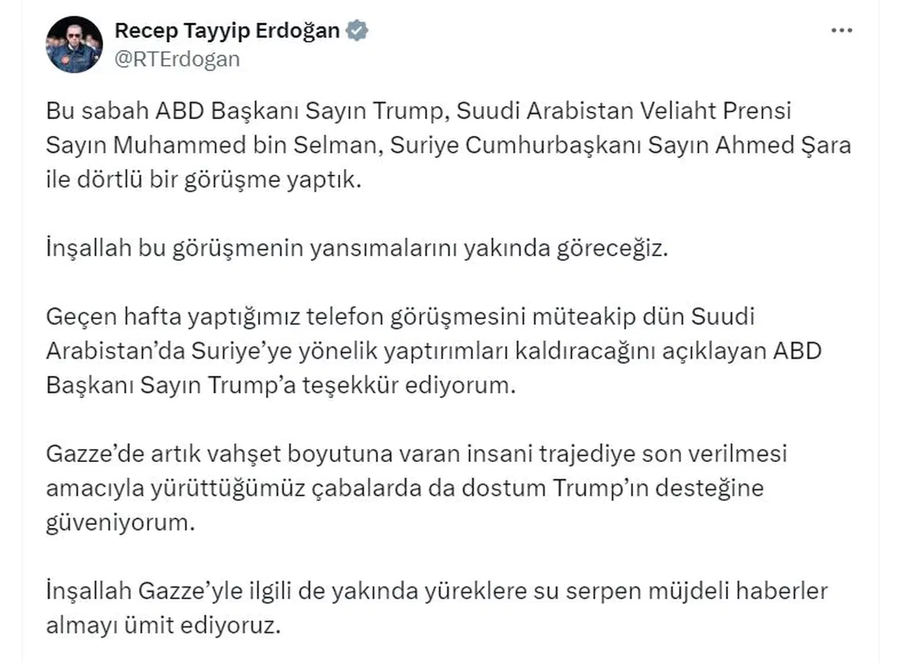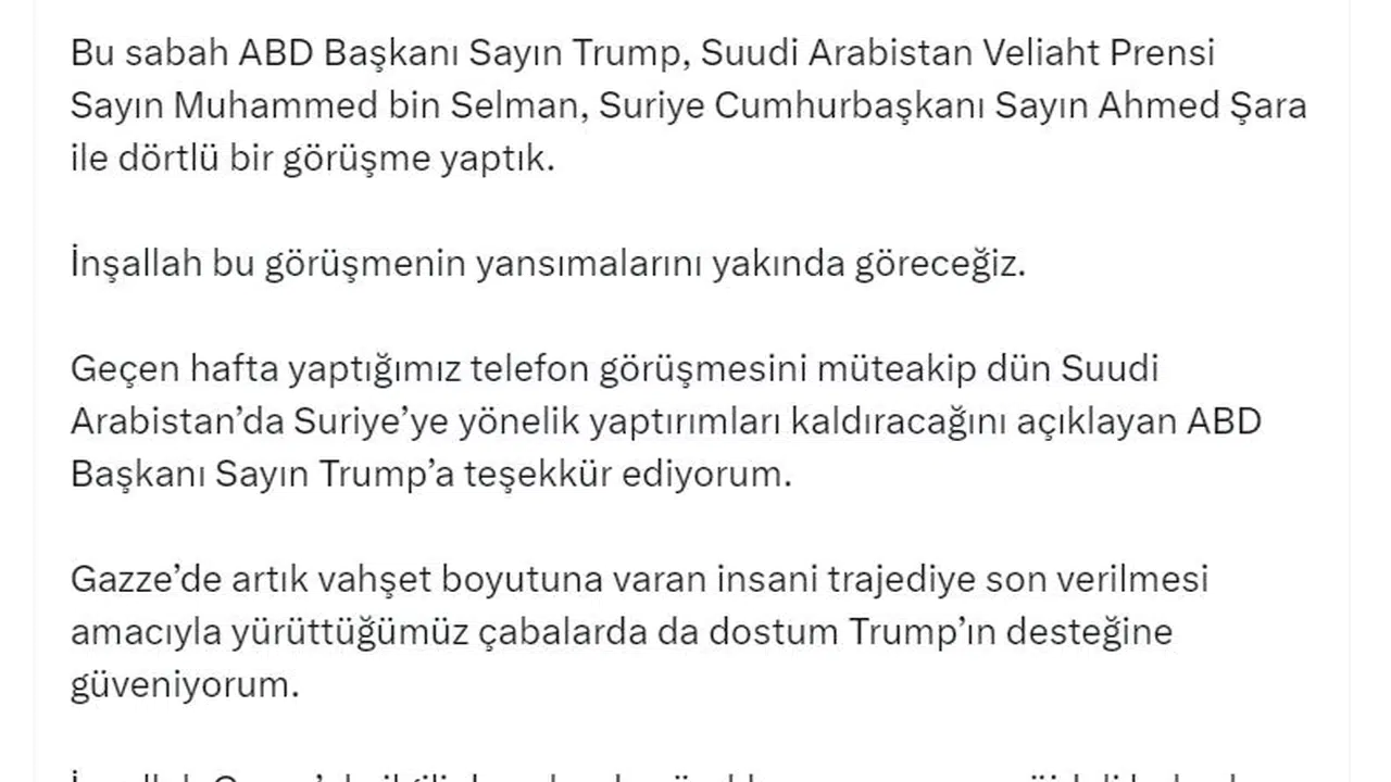 Cumhurbaşkanı Erdoğan, görüşmeye ilişkin sosyal medya hesabından açıklama yaptı. Erdoğan, "Bu sabah ABD Başkanı Sayın Trump, Suudi Arabistan Veliaht Prensi Sayın Muhammed bin Selman, Suriye Cumhurbaşkanı Sayın Ahmed Şara ile dörtlü bir görüşme yaptık. İnşallah bu görüşmenin yansımalarını yakında göreceğiz. Geçen hafta yaptığımız telefon görüşmesini müteakip dün Suudi Arabistan’da Suriye’ye yönelik yaptırımları kaldıracağını açıklayan ABD Başkanı Sayın Trump’a teşekkür ediyorum. Gazze’de artık vahşet boyutuna varan insani trajediye son verilmesi amacıyla yürüttüğümüz çabalarda da dostum Trump’ın desteğine güveniyorum. İnşallah Gazze’yle ilgili de yakında yüreklere su serpen müjdeli haberler almayı ümit ediyoruz" dedi. (DHA)