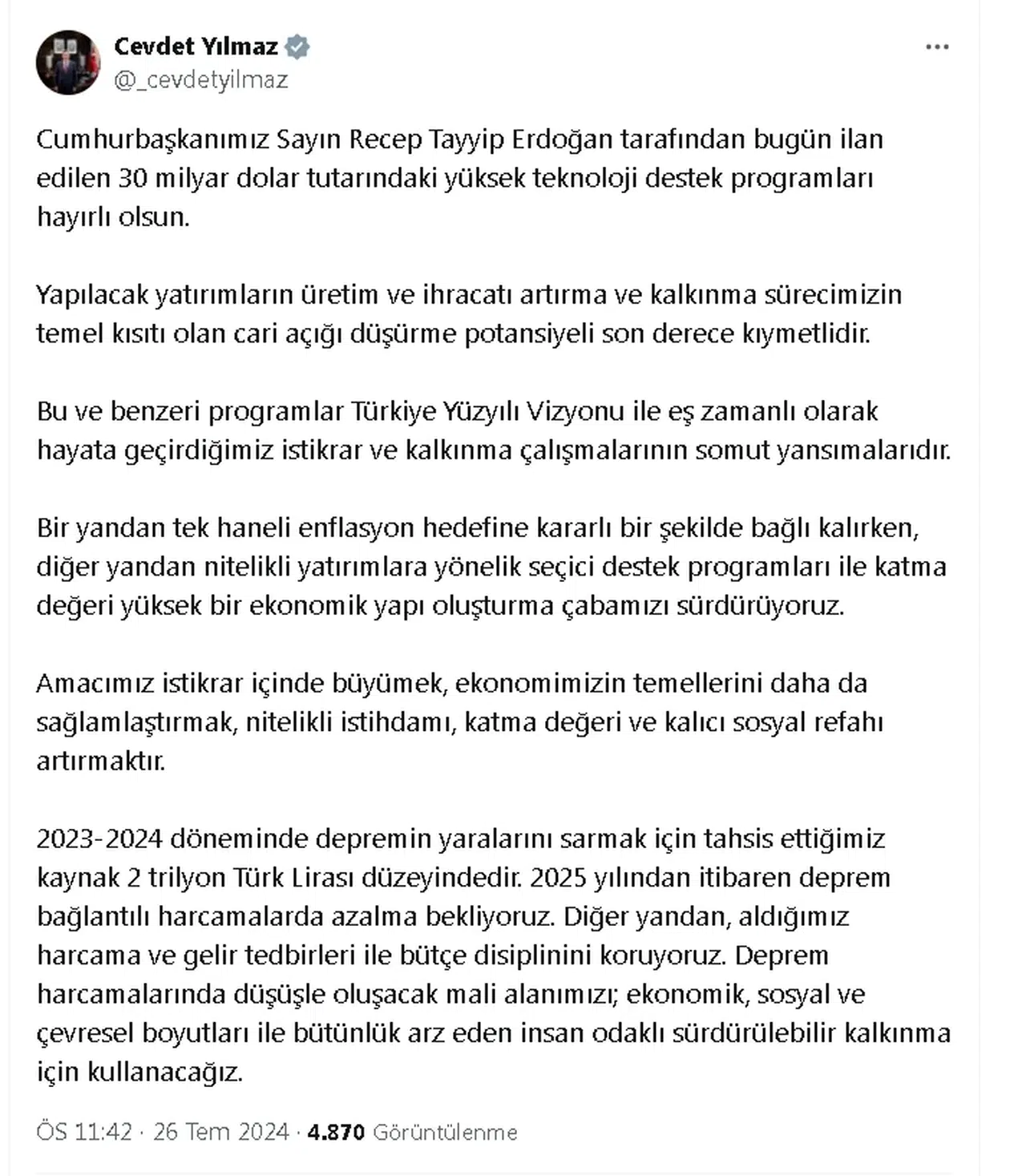 Cumhurbaşkanı Yardımcısı Cevdet Yılmaz, sosyal medya hesabından yaptığı paylaşımda, bugün HIT-30 Yüksek Teknoloji Yatırım Programı Tanıtım toplantısında Cumhurbaşkanı Recep Tayyip Erdoğan tarafından ilan edilen 30 milyar dolar tutarındaki yüksek teknoloji destek programlarnın hayırlı olması dileğinde bulundu. Yılmaz açıklamasında, "Cumhurbaşkanımız Sayın Recep Tayyip Erdoğan tarafından bugün ilan edilen 30 milyar dolar tutarındaki yüksek teknoloji destek programları hayırlı olsun. Yapılacak yatırımların üretim ve ihracatı artırma ve kalkınma sürecimizin temel kısıtı olan cari açığı düşürme potansiyeli son derece kıymetlidir Bu ve benzeri programlar Türkiye Yüzyılı Vizyonu ile eş zamanlı olarak hayata geçirdiğimiz istikrar ve kalkınma çalışmalarının somut yansımalarıdır. Bir yandan tek haneli enflasyon hedefine kararlı bir şekilde bağlı kalırken, diğer yandan nitelikli yatırımlara yönelik seçici destek programları ile katma değeri yüksek bir ekonomik yapı oluşturma çabamızı sürdürüyoruz" dedi.