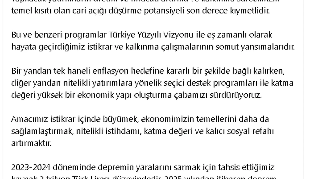 Cumhurbaşkanı Yardımcısı Yılmaz, programın amacının istikrar içinde büyümek, Türkiye ekonomisinin temellerini daha da sağlamlaştırmak, nitelikli istihdamı, katma değeri ve kalıcı sosyal refahı arttırmak olduğuna değinerek, "2023-2024 döneminde depremin yaralarını sarmak için tahsis ettiğimiz kaynak 2 trilyon Türk Lirası düzeyindedir. 2025 yılından itibaren deprem bağlantılı harcamalarda azalma bekliyoruz. Diğer yandan, aldığımız harcama ve gelir tedbirleri ile bütçe disiplinini koruyoruz. Deprem harcamalarında düşüşle oluşacak mali alanımızı; ekonomik, sosyal ve çevresel boyutları ile bütünlük arz eden insan odaklı sürdürülebilir kalkınma için kullanacağız" ifadelerini kullandı. (DHA)
