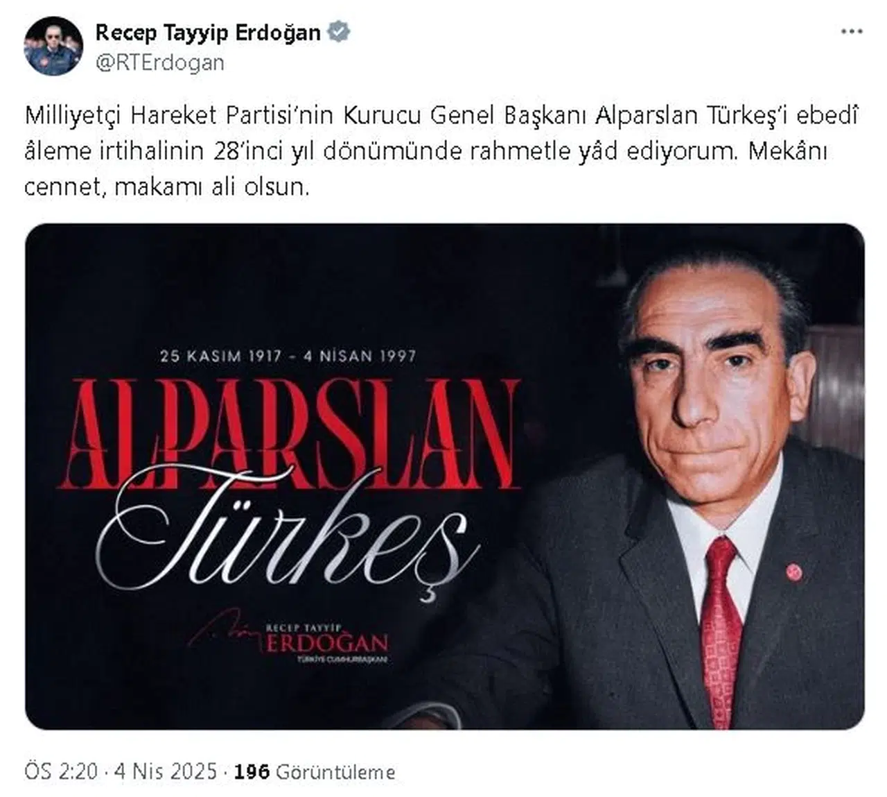 Cumhurbaşkanı Recep Tayyip Erdoğan, sosyal medya hesabından yaptığı açıklamada, "Milliyetçi Hareket Partisi'nin Kurucu Genel Başkanı Alparslan Türkeş'i ebedi aleme irtihalinin 28'inci yıl dönümünde rahmetle yad ediyorum. Mekanı cennet, makamı ali olsun" dedi. (DHA)