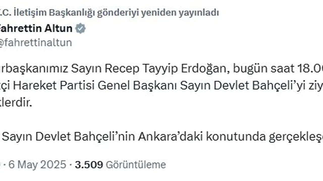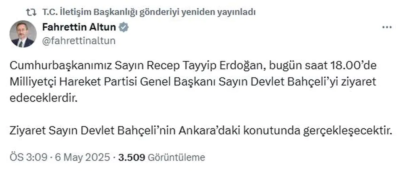 İletişim Başkanı Fahrettin Altun, sosyal medya hesabından yaptığı açıklamada, "Cumhurbaşkanımız Sayın Recep Tayyip Erdoğan, bugün saat 18.00'de Milliyetçi Hareket Partisi Genel Başkanı Sayın Devlet Bahçeli'yi ziyaret edeceklerdir. Ziyaret, Sayın Devlet Bahçeli'nin Ankara'daki konutunda gerçekleşecektir" denildi. (DHA)