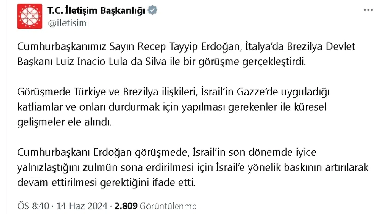 İletişim Başkanlığı sosyal medya hesabından yaptığı paylaşımda, Cumhurbaşkanı Recep Tayyip Erdoğan'ın G7 Zirvesi’ne katılmak üzere gittiği İtalya’da, Brezilya Devlet Başkanı Luiz Inacio Lula da Silva ile bir görüşme gerçekleştirdiğini bildirdi. Görüşmede Türkiye ve Brezilya ilişkileri ve İsrail- Gazze savaşını durdurmak için yapılması gerekenler ile küresel gelişmeler ele alındığı belirtildi. Yapılan paylaşımda, "Cumhurbaşkanı Erdoğan görüşmede, İsrail’in son dönemde iyice yalnızlaştığını zulmün sona erdirilmesi için İsrail’e yönelik baskının artırılarak devam ettirilmesi gerektiğini ifade etti" ifadeleri kullanıldı. (DHA)