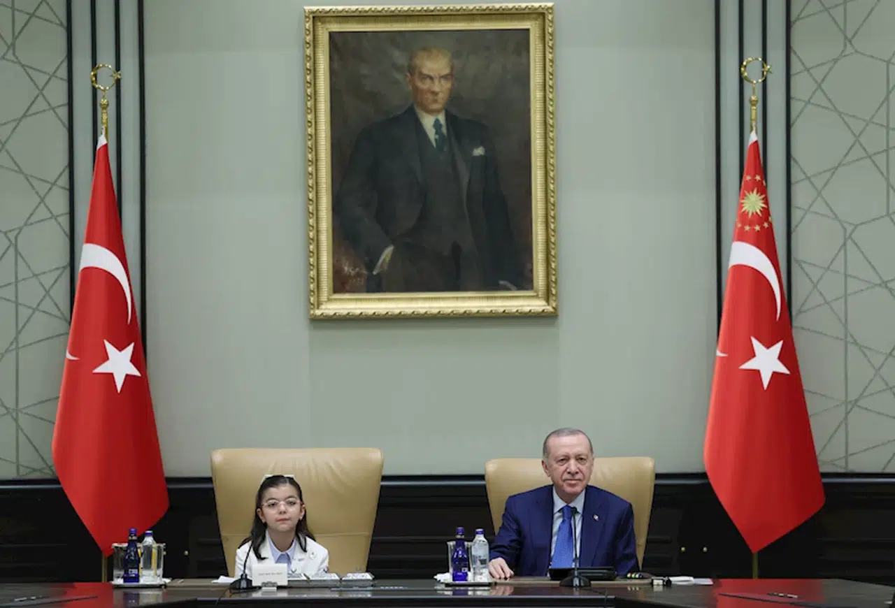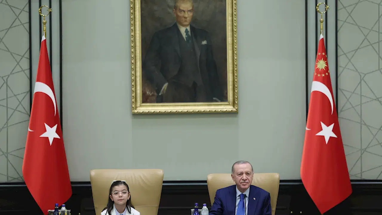 Cumhurbaşkanı Erdoğan, 23 Nisan Ulusal Egemenlik ve Çocuk Bayramı'nda Cumhurbaşkanlığı Külliyesi'nde, kabine toplantısının yapıldığı salonda Bakan Tekin ve beraberindeki çocukları kabul etti. Erdoğan, koltuğunu Hacı Mustafa Tarman Ortaokulu'nda 4'üncü sınıf öğrencisi İpek Vera Yolcu'ya bıraktı. Cumhurbaşkanı Erdoğan, tüm çocukların 23 Nisan Milli Egemenlik ve Çocuk Bayramı'nı kutlayarak, 23 Nisan'ın milletçe büyük bir coşkuyla kutlandığını söyledi. Erdoğan, "Vatanımız, bağımsızlığımız, istikbalimiz uğruna canını veren şehitlerimizi bugün bir kez daha rahmetle yad ediyorum. Gazi Mustafa Kemal ve silah arkadaşları başta olmak üzere, Türkiye Cumhuriyeti'nin kuruluşundan bugünlere güçlü ve özgür bir devlet haline gelmesinde emeği olan herkesi şükranla anıyorum. Her birinizin gözlerindeki heyecanı gördükçe, aydınlık yarınlarımıza olan inancımızın arttığını özellikle vurgulamak istiyorum. Her birinizin tek tek gözlerinden öpüyorum" dedi.
