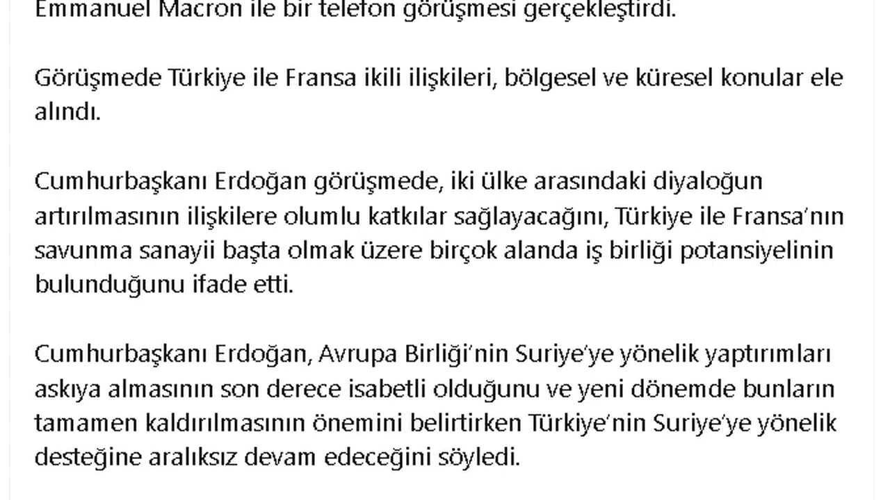İletişim Başkanlığı sosyal medya hesabından paylaşım yaparak, Cumhurbaşkanı Recep Tayyip Erdoğan'ın Fransa Cumhurbaşkanı Emmanuel Macron ile bir telefon görüşmesi gerçekleştirdiğini açıkladı. Görüşmede Türkiye ile Fransa ikili ilişkileri, bölgesel ve küresel konular ele alındı. Cumhurbaşkanı Erdoğan görüşmede, iki ülke arasındaki diyaloğun artırılmasının ilişkilere olumlu katkılar sağlayacağını, Türkiye ile Fransa’nın savunma sanayii başta olmak üzere birçok alanda iş birliği potansiyelinin bulunduğunu ifade etti. Cumhurbaşkanı Erdoğan, Avrupa Birliği’nin Suriye’ye yönelik yaptırımları askıya almasının son derece isabetli olduğunu ve yeni dönemde bunların tamamen kaldırılmasının önemini belirtirken, Türkiye’nin Suriye’ye yönelik desteğine aralıksız devam edeceğini söyledi. Cumhurbaşkanı Erdoğan, Hamas ile İsrail arasındaki ateşkesin korunması ve kalıcı çözüm için çalışmalara başlanması gerektiğini ifade etti. (DHA)