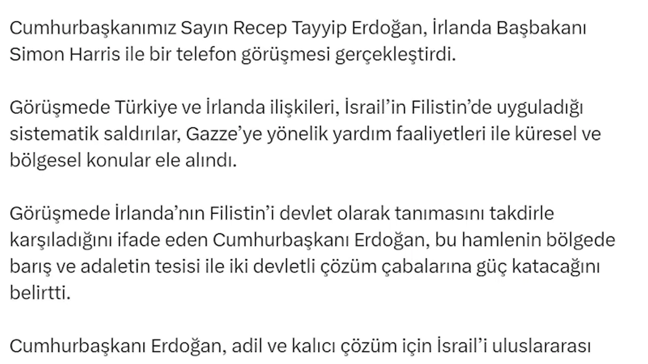 İletişim Başkanlığı'nın sosyal medya hesabından yapılan açıklamada, "Cumhurbaşkanımız Sayın Recep Tayyip Erdoğan, İrlanda Başbakanı Simon Harris ile bir telefon görüşmesi gerçekleştirdi. Görüşmede Türkiye ve İrlanda ilişkileri, İsrail'in Filistin'de uyguladığı sistematik saldırılar, Gazze'ye yönelik yardım faaliyetleri ile küresel ve bölgesel konular ele alındı. Görüşmede İrlanda'nın Filistin'i devlet olarak tanımasını takdirle karşıladığını ifade eden Cumhurbaşkanı Erdoğan, bu hamlenin bölgede barış ve adaletin tesisi ile iki devletli çözüm çabalarına güç katacağını belirtti. Cumhurbaşkanı Erdoğan, adil ve kalıcı çözüm için İsrail'i uluslararası hukuka uymaya zorlayıcı adımların şart olduğunu ve hep birlikte barış vizyonunu canlı tutmak gerektiğini söyledi" denildi. (DHA)