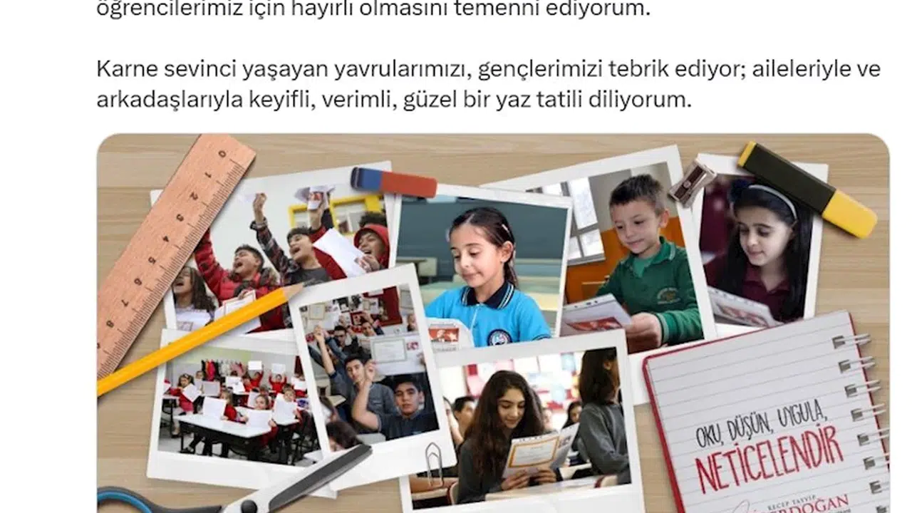 Cumhurbaşkanı Erdoğan, sosyal medya hesabından paylaştığı karne mesajında, "Bugün tamamlanan eğitim-öğretim yılının ülkemiz, milletimiz ve tüm öğrencilerimiz için hayırlı olmasını temenni ediyorum. Karne sevinci yaşayan yavrularımızı, gençlerimizi tebrik ediyor; aileleriyle ve arkadaşlarıyla keyifli, verimli, güzel bir yaz tatili diliyorum" dedi. (DHA)