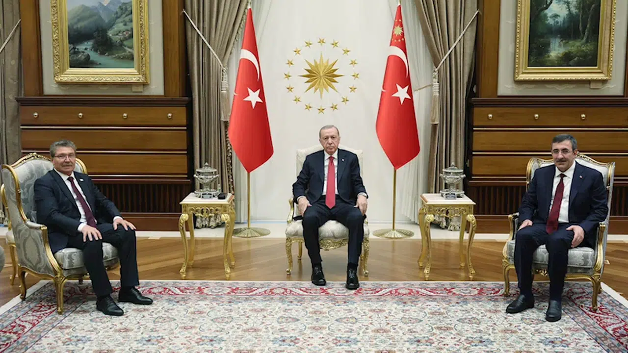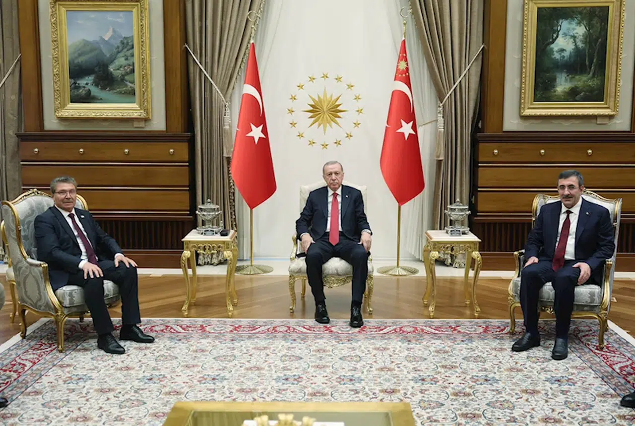 Cumhurbaşkanı Erdoğan, Cumhurbaşkanlığı Külliyesi'nde KKTC Başbakanı Ünal Üstel ile bir araya geldi. Basına kapalı gerçekleşen görüşmede Cumhurbaşkanı Yardımcısı Cevdet Yılmaz da yer aldı. (DHA)