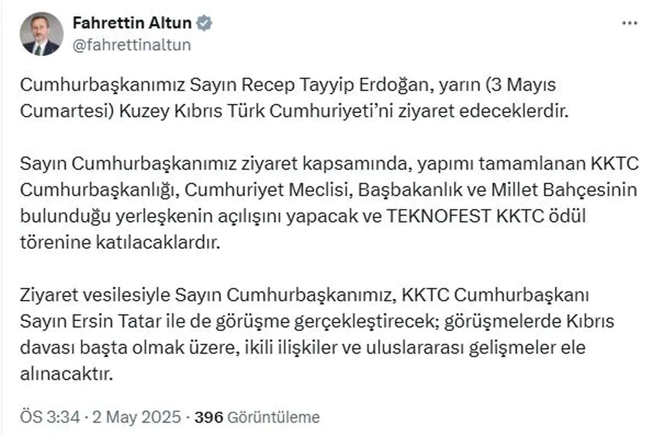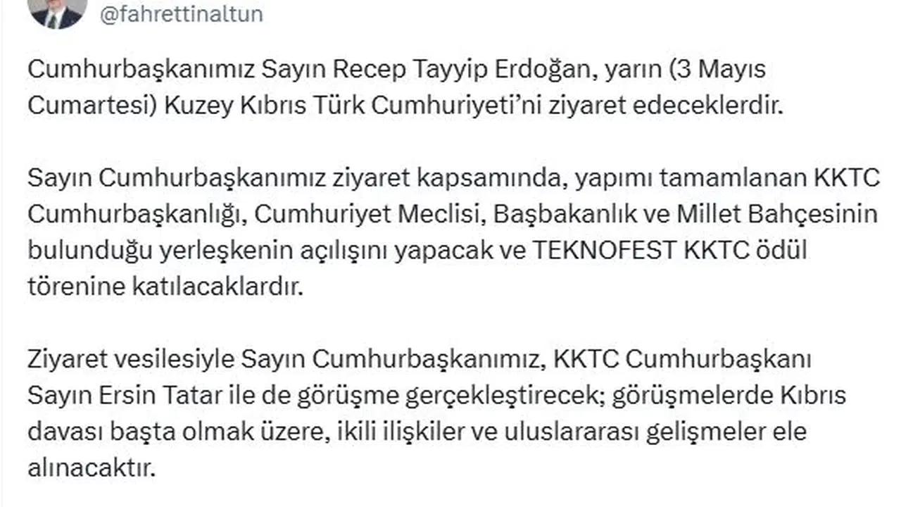 İletişim Başkanı Fahrettin Altun, sosyal medya hesabından yaptığı açıklamada, "Cumhurbaşkanımız Sayın Recep Tayyip Erdoğan, yarın Kuzey Kıbrıs Türk Cumhuriyeti'ni ziyaret edeceklerdir. Sayın Cumhurbaşkanımız ziyaret kapsamında, yapımı tamamlanan KKTC Cumhurbaşkanlığı, Cumhuriyet Meclisi, Başbakanlık ve Millet Bahçesi'nin bulunduğu yerleşkenin açılışını yapacak ve TEKNOFEST KKTC ödül törenine katılacaklardır. Ziyaret vesilesiyle Sayın Cumhurbaşkanımız, KKTC Cumhurbaşkanı Sayın Ersin Tatar ile de görüşme gerçekleştirecek; görüşmelerde Kıbrıs davası başta olmak üzere, ikili ilişkiler ve uluslararası gelişmeler ele alınacaktır" ifadelerini kullandı. (DHA)