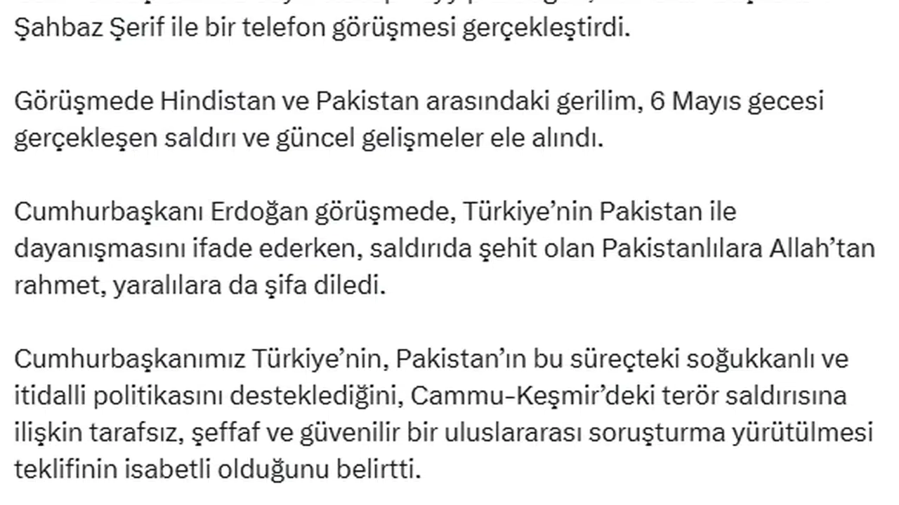 İletişim Başkanlığı’ndan yapılan açıklamaya göre, Cumhurbaşkanı Recep Tayyip Erdoğan, Pakistan Başbakanı Şahbaz Şerif ile bir telefon görüşmesi gerçekleştirdi. Görüşmede Hindistan ve Pakistan arasındaki gerilim, 6 Mayıs gecesi gerçekleşen saldırı ve güncel gelişmeler ele alındı. Cumhurbaşkanı Erdoğan görüşmede, Türkiye’nin Pakistan ile dayanışmasını ifade ederken, saldırıda şehit olan Pakistanlılara Allah’tan rahmet, yaralılara da şifa diledi. Cumhurbaşkanı Türkiye’nin, Pakistan’ın bu süreçteki soğukkanlı ve itidalli politikasını desteklediğini, Cammu-Keşmir’deki terör saldırısına ilişkin tarafsız, şeffaf ve güvenilir bir uluslararası soruşturma yürütülmesi teklifinin isabetli olduğunu belirtti. Cumhurbaşkanı Erdoğan, Türkiye’nin gerilimin tırmanmasını önlemek için elinden geleni yapmaya hazır olduğunu, bu konuda diplomatik temasların sürdürüleceğini ifade etti. (DHA)