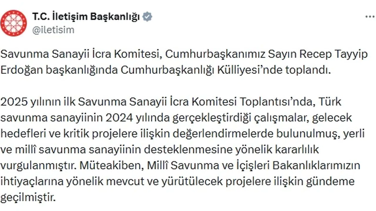 Savunma Sanayii İcra Komitesi Toplantısı’nda ele alınan konular hakkında Cumhurbaşkanlığı İletişim Başkanlığı tarafından sosyal medya hesabı üzerinden açıklama yapıldı. Açıklamada, 2025 yılının ilk Savunma Sanayii İcra Komitesi Toplantısı’nda, Türk savunma sanayiinin 2024 yılında gerçekleştirdiği çalışmalar, gelecek hedefleri ve kritik projelere ilişkin değerlendirmelerde bulunulduğu, yerli ve milli savunma sanayiinin desteklenmesine yönelik kararlılığın vurgulandığı kaydedildi.