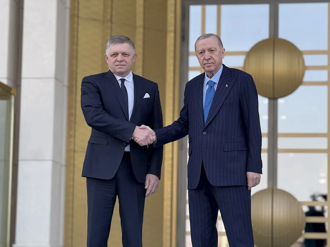 Cumhurbaşkanı Recep Tayyip Erdoğan, Türkiye'ye resmi ziyarette bulunan Slovak Cumhuriyeti Başbakanı Robert Fico'yu Cumhurbaşkanlığı Külliyesi'nde düzenlenen resmi törenle karşıladı. Cumhurbaşkanı Erdoğan ve Slovak Cumhuriyeti Başbakanı Fico'nun tören alanındaki yerlerini almasının ardından, 21 pare top atışı eşliğinde 2 ülkenin milli marşları çalındı. Fico, Muhafız Alayı Tören Kıtası'nı 'Merhaba Asker' diyerek selamladı. Heyetlerini birbirine takdim eden Erdoğan ve Fico, merdivenlerde Türkiye ve Slovak bayrakları önünde poz verdi. Baş başa ve heyetler arası görüşmelere geçen Erdoğan ve Fico, ardından ortak basın toplantısı düzenlenecek. (DHA)