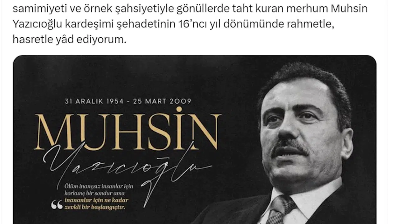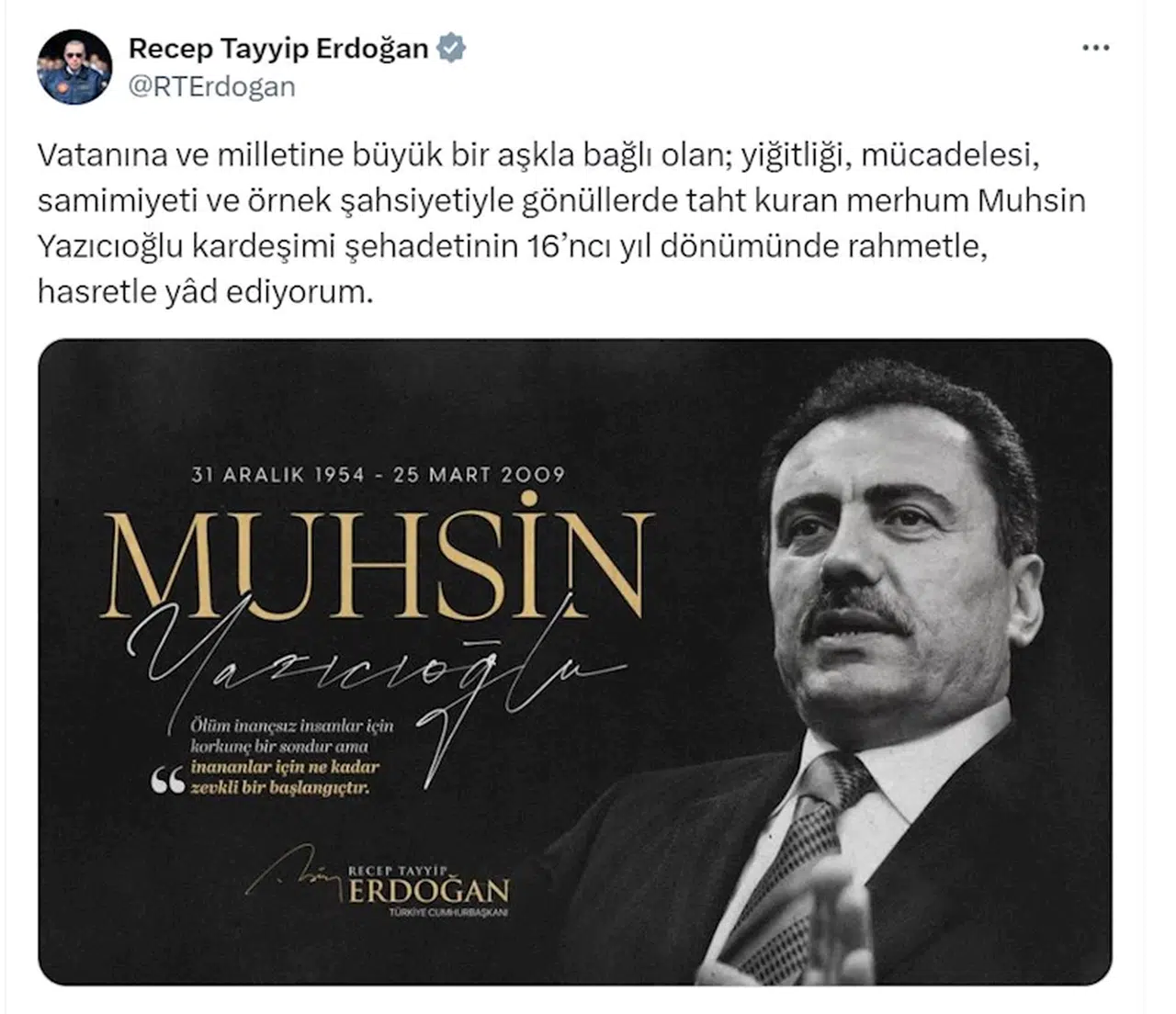 ANKARA, (DHA)- CUMHURBAŞKANI Recep Tayyip Erdoğan, Büyük Birlik Partisi merhum Genel Başkanı Muhsin Yazıcıoğlu'nu ölümünün 16'ncı yıl dönümünde andı.