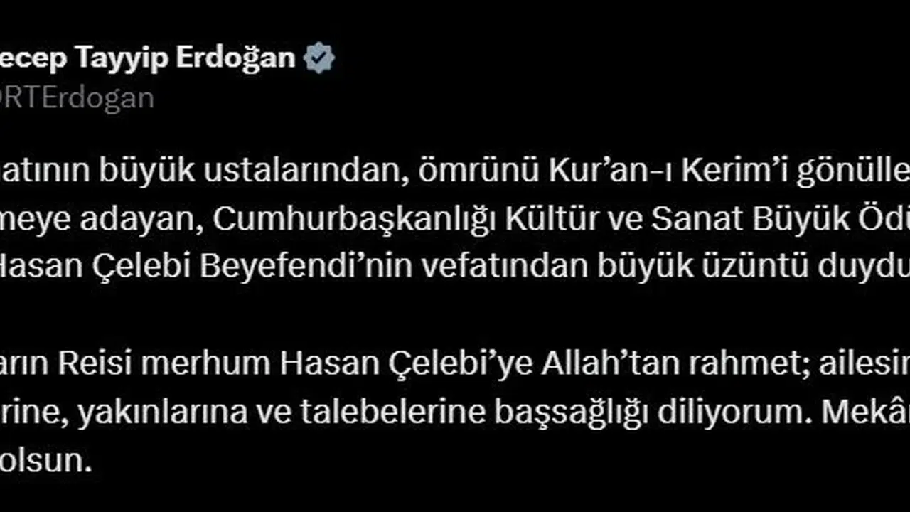 Cumhurbaşkanı Erdoğan, sosyal medya hesabı üzerinden yaptığı paylaşımda, "Hat sanatının büyük ustalarından, ömrünü Kur'an-ı Kerim'i gönüllere nakşetmeye adayan, Cumhurbaşkanlığı Kültür ve Sanat Büyük Ödülü sahibi Hasan Çelebi Beyefendi'nin vefatından büyük üzüntü duydum. Hattatların reisi merhum Hasan Çelebi’ye Allah’tan rahmet; ailesine, sevenlerine, yakınlarına ve talebelerine başsağlığı diliyorum. Mekanı cennet olsun" ifadelerini kullandı. (DHA)