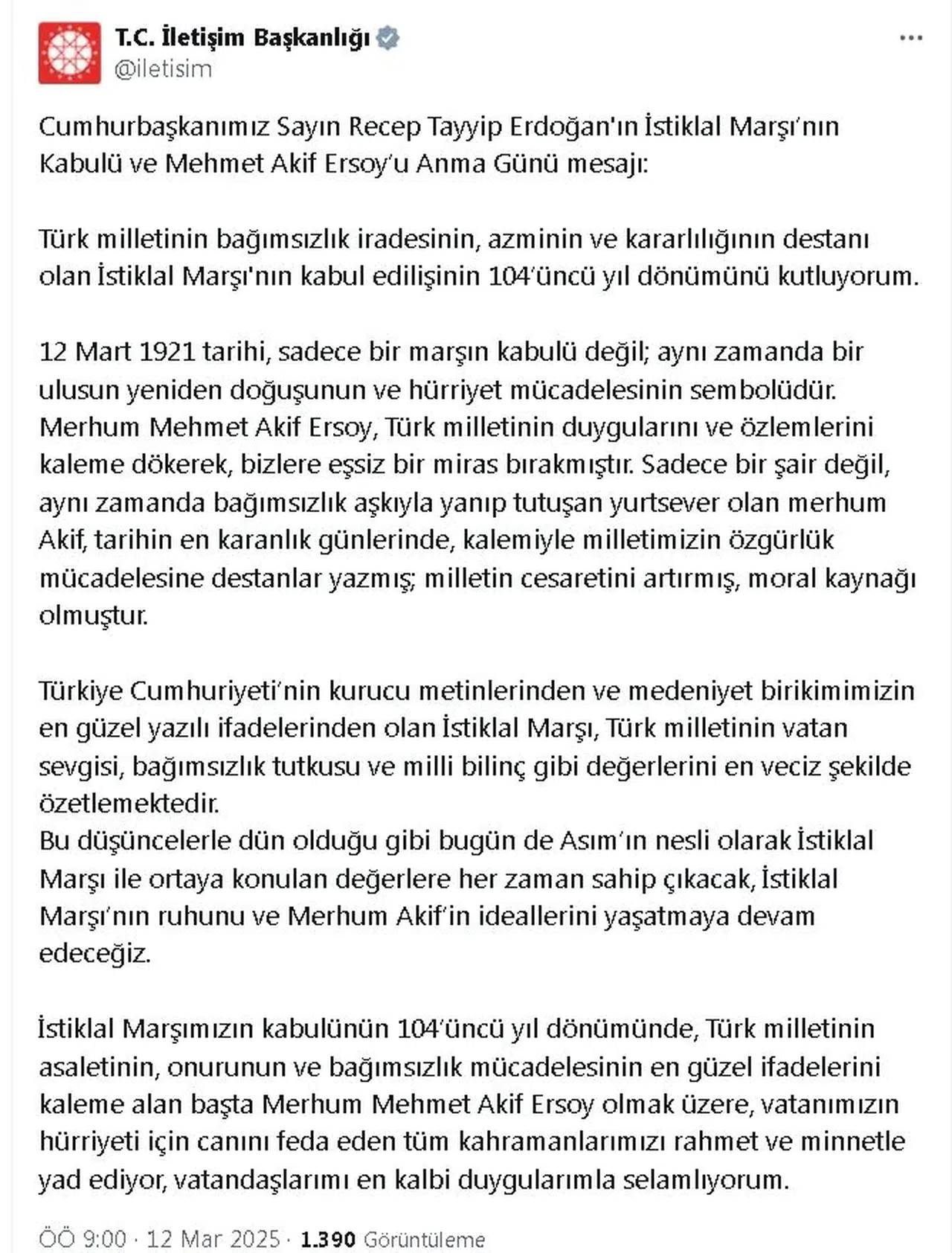ANKARA, (DHA)- CUMHURBAŞKANI Recep Tayyip Erdoğan, İstiklal Marşı'nın kabulünün 104'üncü yıl dönümünü kutladı.