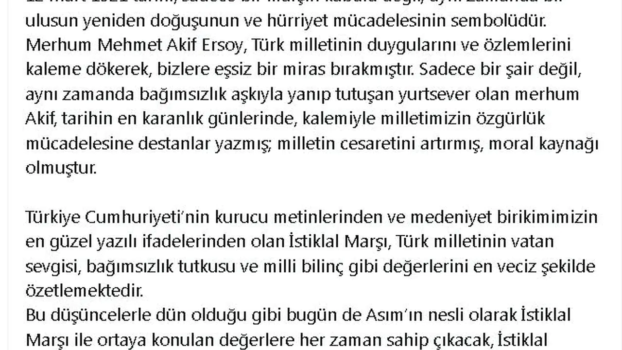 İletişim Başkanlığı'nın sosyal medya hesabından, Cumhurbaşkanı Recep Tayyip Erdoğan'ın İstiklal Marşı'nın Kabulü ve Mehmet Akif Ersoy'u Anma Günü mesajı paylaşıldı. Cumhurbaşkanı Erdoğan, mesajında, "Türk milletinin bağımsızlık iradesinin, azminin ve kararlılığının destanı olan İstiklal Marşı'nın kabul edilişinin 104'üncü yıl dönümünü kutluyorum. 12 Mart 1921 tarihi, sadece bir marşın kabulü değil; aynı zamanda bir ulusun yeniden doğuşunun ve hürriyet mücadelesinin sembolüdür. Merhum Mehmet Akif Ersoy, Türk milletinin duygularını ve özlemlerini kaleme dökerek, bizlere eşsiz bir miras bırakmıştır. Sadece bir şair değil, aynı zamanda bağımsızlık aşkıyla yanıp tutuşan yurtsever olan merhum Akif, tarihin en karanlık günlerinde, kalemiyle milletimizin özgürlük mücadelesine destanlar yazmış; milletin cesaretini artırmış, moral kaynağı olmuştur. Türkiye Cumhuriyeti'nin kurucu metinlerinden ve medeniyet birikimimizin en güzel yazılı ifadelerinden olan İstiklal Marşı, Türk milletinin vatan sevgisi, bağımsızlık tutkusu ve milli bilinç gibi değerlerini en veciz şekilde özetlemektedir. Bu düşüncelerle dün olduğu gibi bugün de Asım'ın nesli olarak İstiklal Marşı ile ortaya konulan değerlere her zaman sahip çıkacak, İstiklal Marşı'nın ruhunu ve Merhum Akif'in ideallerini yaşatmaya devam edeceğiz. İstiklal Marşı'mızın kabulünün 104'üncü yıl dönümünde, Türk milletinin asaletinin, onurunun ve bağımsızlık mücadelesinin en güzel ifadelerini kaleme alan başta merhum Mehmet Akif Ersoy olmak üzere, vatanımızın hürriyeti için canını feda eden tüm kahramanlarımızı rahmet ve minnetle yad ediyor, vatandaşlarımı en kalbi duygularımla selamlıyorum" ifadelerini kullandı. (DHA)