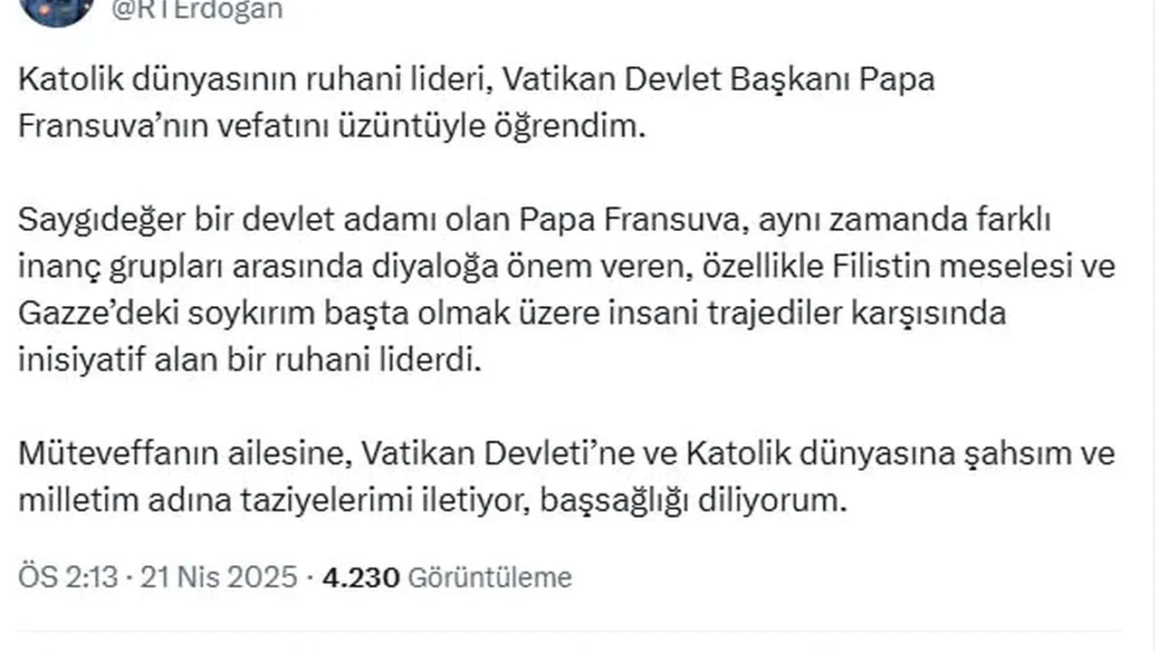 Cumhurbaşkanı Recep Tayyip Erdoğan, "Katolik dünyasının ruhani lideri, Vatikan Devlet Başkanı Papa Fransuva’nın vefatını üzüntüyle öğrendim. Saygıdeğer bir devlet adamı olan Papa Fransuva, aynı zamanda farklı inanç grupları arasında diyaloğa önem veren, özellikle Filistin meselesi ve Gazze’deki soykırım başta olmak üzere insani trajediler karşısında inisiyatif alan bir ruhani liderdi. Müteveffanın ailesine, Vatikan Devleti’ne ve Katolik dünyasına şahsım ve milletim adına taziyelerimi iletiyor, başsağlığı diliyorum" ifadelerini kullandı. (DHA)