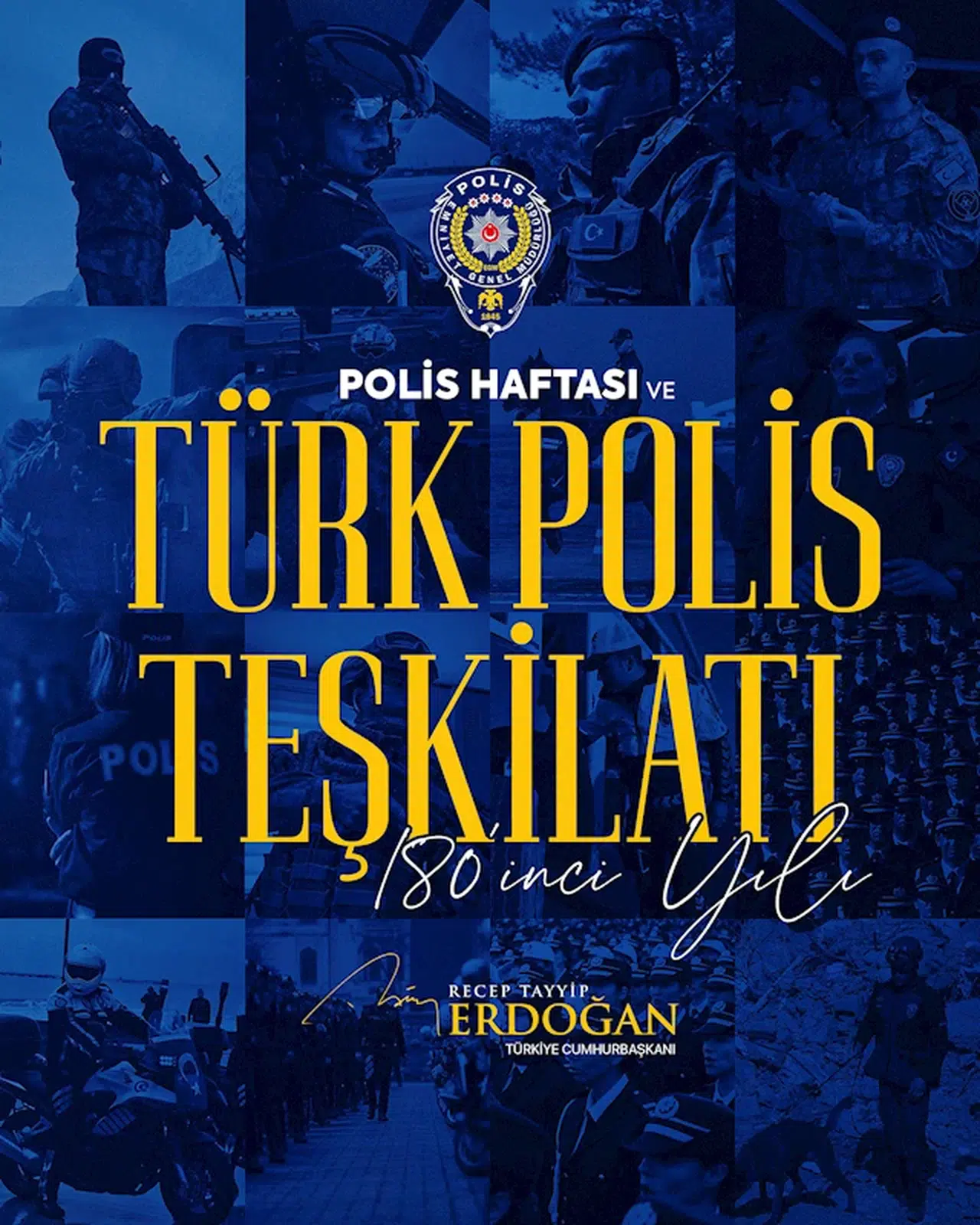 ANKARA, (DHA)- CUMHURBAŞKANI Recep Tayyip Erdoğan, "Türk Polis Teşkilatımızın kuruluşunun 180’inci yıl dönümünü canıgönülden tebrik ediyor; Polis Haftası’nın Emniyet Teşkilatımız, ülkemiz ve milletimiz için hayırlara vesile olmasını diliyorum" dedi.