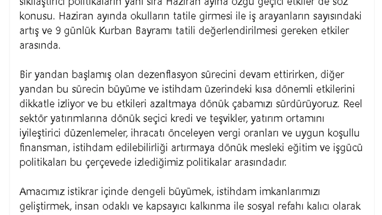 Cumhurbaşkanı Yardımcısı Cevdet Yılmaz sosyal medya hesabından paylaşım yaparak, haziran ayında işsizlik oranının yüzde 9,2’ye yükseldiğini, ancak bu oranın Orta Vadeli Program (OVP) tahmini olan yüzde 10,3’ün altında kaldığını belirterek, "Haziran ayındaki artışta enflasyonla mücadele sürecinde uygulanan sıkılaştırıcı politikaların yanı sıra haziran ayına özgü geçici etkiler de söz konusu. Haziran ayında okulların tatile girmesi ile iş arayanların sayısındaki artış ve 9 günlük Kurban Bayramı tatili değerlendirilmesi gereken etkiler arasında" ifadelerini kullandı.