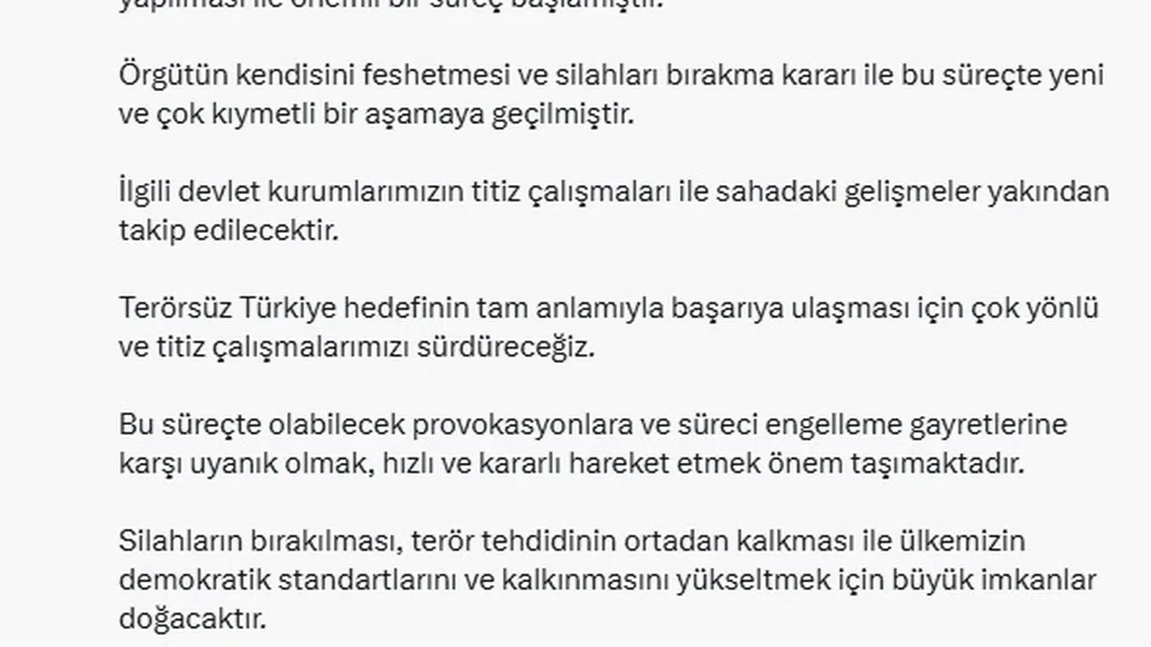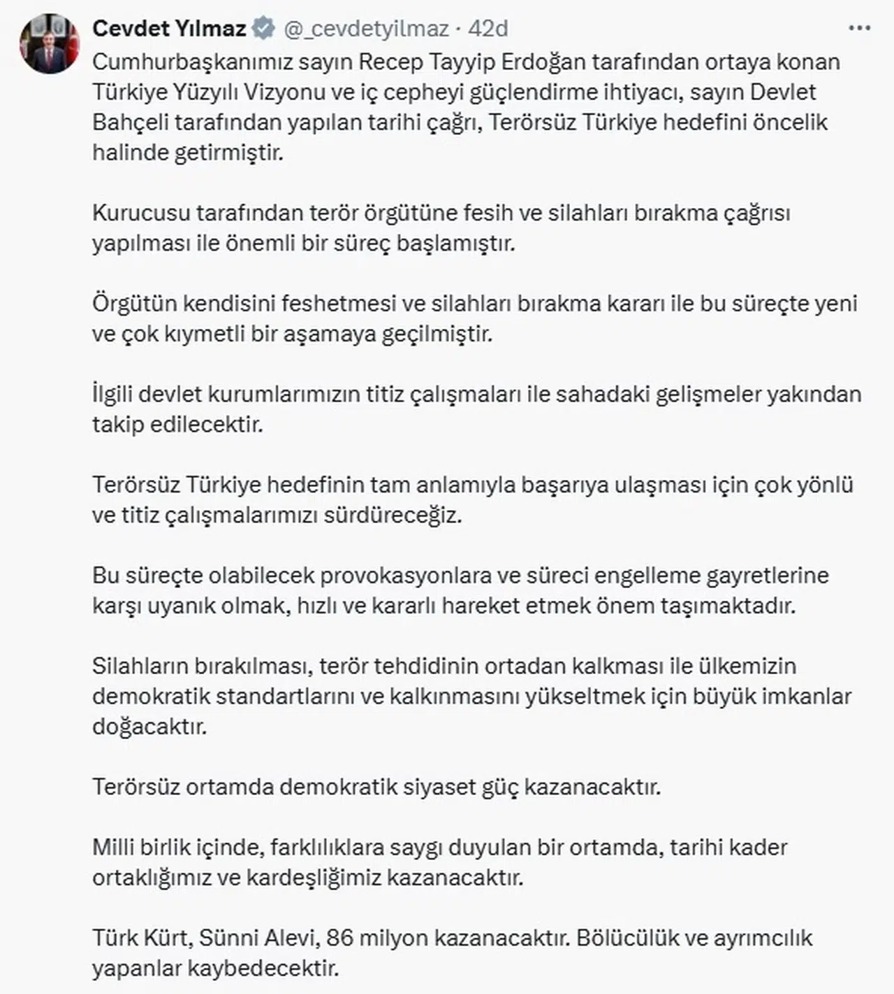 Cumhurbaşkanı Yardımcısı Cevdet Yılmaz, terör örgütü PKK'nın fesih ve silah bırakma kararına ilişkin sosyal medya hesabından açıklamada bulundu. Yılmaz, Cumhurbaşkanı Recep Tayyip Erdoğan tarafından ortaya konulan Türkiye Yüzyılı vizyonu ile iç cepheyi güçlendirme ihtiyacı ve Devlet Bahçeli tarafından yapılan tarihi çağrının, 'Terörsüz Türkiye' hedefini öncelik haline getirdiğini belirterek, "Kurucusu tarafından terör örgütüne fesih ve silahları bırakma çağrısı yapılması ile önemli bir süreç başlamıştır. Örgütün kendisini feshetmesi ve silahları bırakma kararı ile bu süreçte yeni ve çok kıymetli bir aşamaya geçilmiştir. İlgili devlet kurumlarımızın titiz çalışmaları ile sahadaki gelişmeler yakından takip edilecektir. Terörsüz Türkiye hedefinin tam anlamıyla başarıya ulaşması için çok yönlü ve titiz çalışmalarımızı sürdüreceğiz. Bu süreçte olabilecek provokasyonlara ve süreci engelleme gayretlerine karşı uyanık olmak, hızlı ve kararlı hareket etmek önem taşımaktadır. Silahların bırakılması, terör tehdidinin ortadan kalkması ile ülkemizin demokratik standartlarını ve kalkınmasını yükseltmek için büyük imkanlar doğacaktır" ifadelerini kullandı.