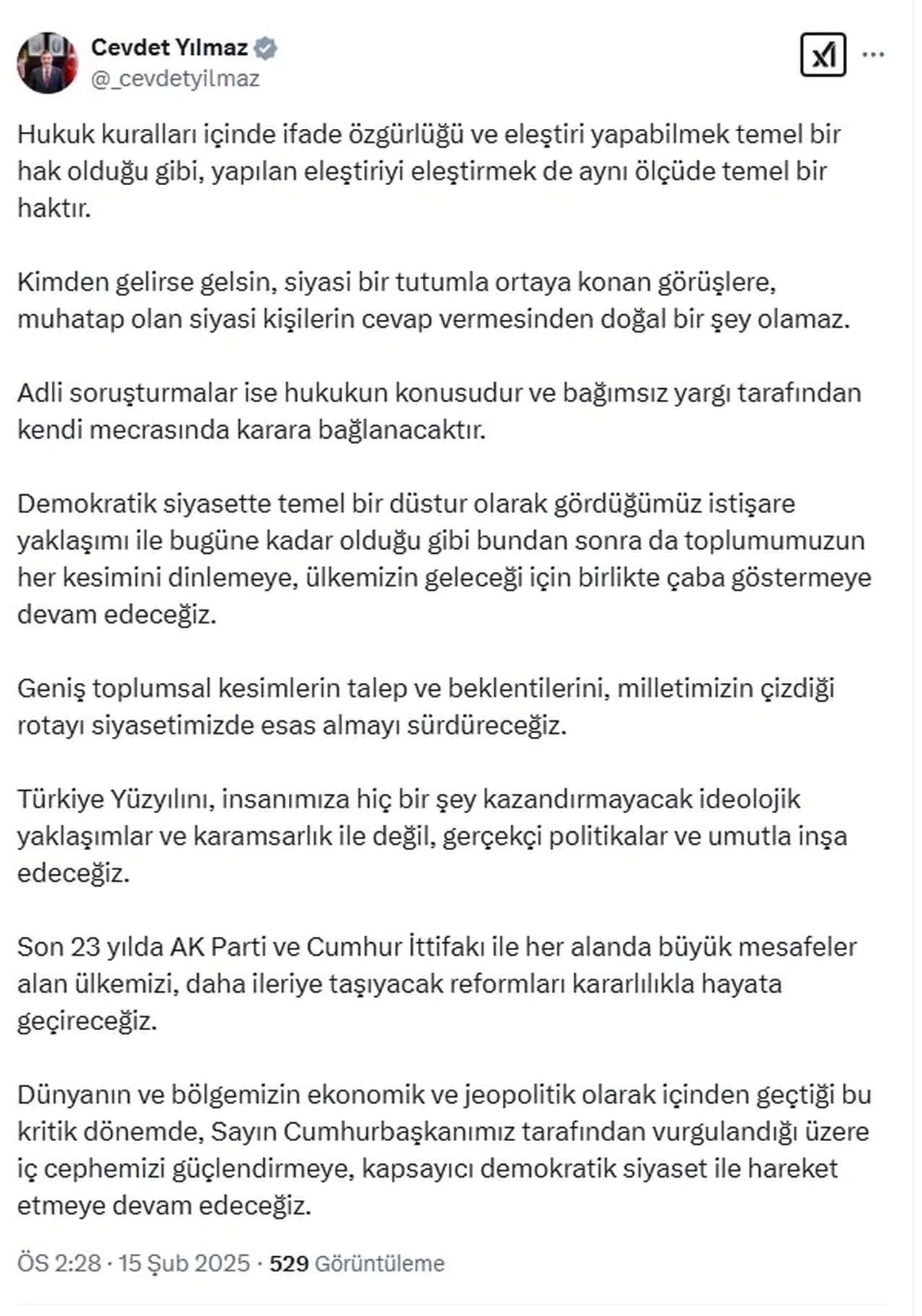 Cevdet Yılmaz, sosyal medya hesabından yaptığı açıklamada, "Hukuk kuralları içinde ifade özgürlüğü ve eleştiri yapabilmek temel bir hak olduğu gibi, yapılan eleştiriyi eleştirmek de aynı ölçüde temel bir haktır. Kimden gelirse gelsin, siyasi bir tutumla ortaya konan görüşlere, muhatap olan siyasi kişilerin cevap vermesinden doğal bir şey olamaz. Adli soruşturmalar ise hukukun konusudur ve bağımsız yargı tarafından kendi mecrasında karara bağlanacaktır. Demokratik siyasette temel bir düstur olarak gördüğümüz istişare yaklaşımı ile bugüne kadar olduğu gibi bundan sonra da toplumumuzun her kesimini dinlemeye, ülkemizin geleceği için birlikte çaba göstermeye devam edeceğiz. Geniş toplumsal kesimlerin talep ve beklentilerini, milletimizin çizdiği rotayı siyasetimizde esas almayı sürdüreceğiz. Türkiye Yüzyılı'nı, insanımıza hiçbir şey kazandırmayacak ideolojik yaklaşımlar ve karamsarlık ile değil, gerçekçi politikalar ve umutla inşa edeceğiz. Son 23 yılda AK Parti ve Cumhur İttifakı ile her alanda büyük mesafeler alan ülkemizi, daha ileriye taşıyacak reformları kararlılıkla hayata geçireceğiz. Dünyanın ve bölgemizin ekonomik ve jeopolitik olarak içinden geçtiği bu kritik dönemde, Sayın Cumhurbaşkanımız tarafından vurgulandığı üzere iç cephemizi güçlendirmeye, kapsayıcı demokratik siyaset ile hareket etmeye devam edeceğiz" dedi. (DHA)