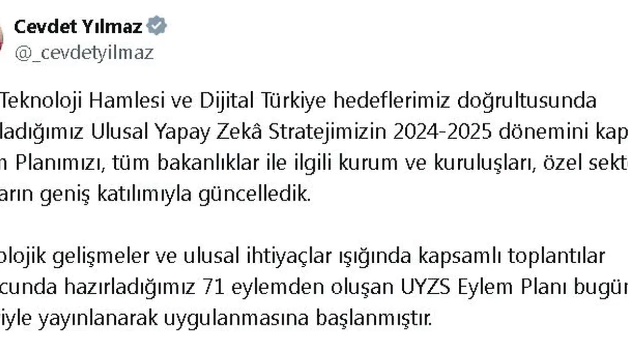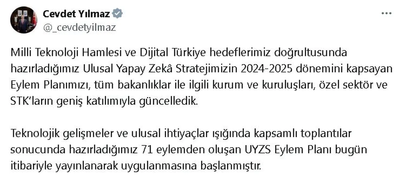 Cumhurbaşkanı Yardımcısı Cevdet Yılmaz, sosyal medya hesabından yaptığı açıklamada, "Milli Teknoloji Hamlesi ve Dijital Türkiye hedeflerimiz doğrultusunda hazırladığımız UYZS'nin 2024-2025 dönemini kapsayan eylem planımızı, tüm bakanlıklar ile ilgili kurum ve kuruluşları, özel sektör ve sivil toplum kuruluşlarının geniş katılımıyla güncelledik. Teknolojik gelişmeler ve ulusal ihtiyaçlar ışığında kapsamlı toplantılar sonucunda hazırladığımız 71 eylemden oluşan UYZS Eylem Planı bugün itibariyle yayınlanarak uygulanmasına başlanmıştır. UYZS Eylem Planımız, Türkçe büyük dil modelinin geliştirilmesi, küresel firmalarla bilgi ve tecrübe paylaşımına yönelik iş birliklerinin ilerletilmesi, yapay zeka girişim ekosisteminin geliştirilmesi, yapay zeka alanında yetkin iş gücünün artırılması, yerli yapay zeka uygulamalarının çoğaltılması, Türkiye'yi küresel oyuncu haline getirecek işlemci altyapısının geliştirilmesi gibi önemli eylemler içeriyor" dedi.