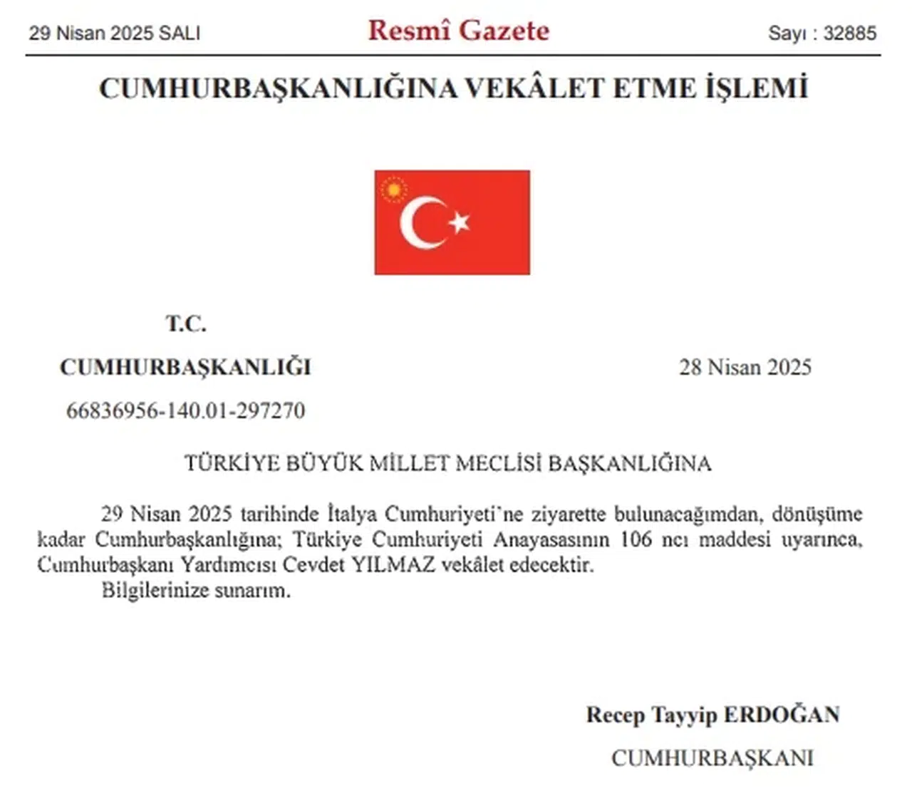 Cumhurbaşkanlığına, Cumhurbaşkanı Yardımcısı Yılmaz'ın vekalet etmesine dair tezkere, Resmi Gazete'de yayımlandı. Tezkereye göre, Cumhurbaşkanı Erdoğan 29 Nisan’da İtalya’yı ziyarette bulunacağından, dönüşüne kadar Cumhurbaşkanlığına; Türkiye Cumhuriyeti Anayasasının 106'ncı maddesi uyarınca, Cumhurbaşkanı Yardımcısı Cevdet Yılmaz vekalet edecek. (DHA)