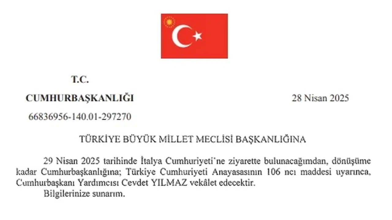 ANKARA, (DHA)- CUMHURBAŞKANI Recep Tayyip Erdoğan'ın İtalya ziyareti dolayısıyla Cumhurbaşkanlığına, Cumhurbaşkanı Yardımcısı Cevdet Yılmaz vekalet edecek.