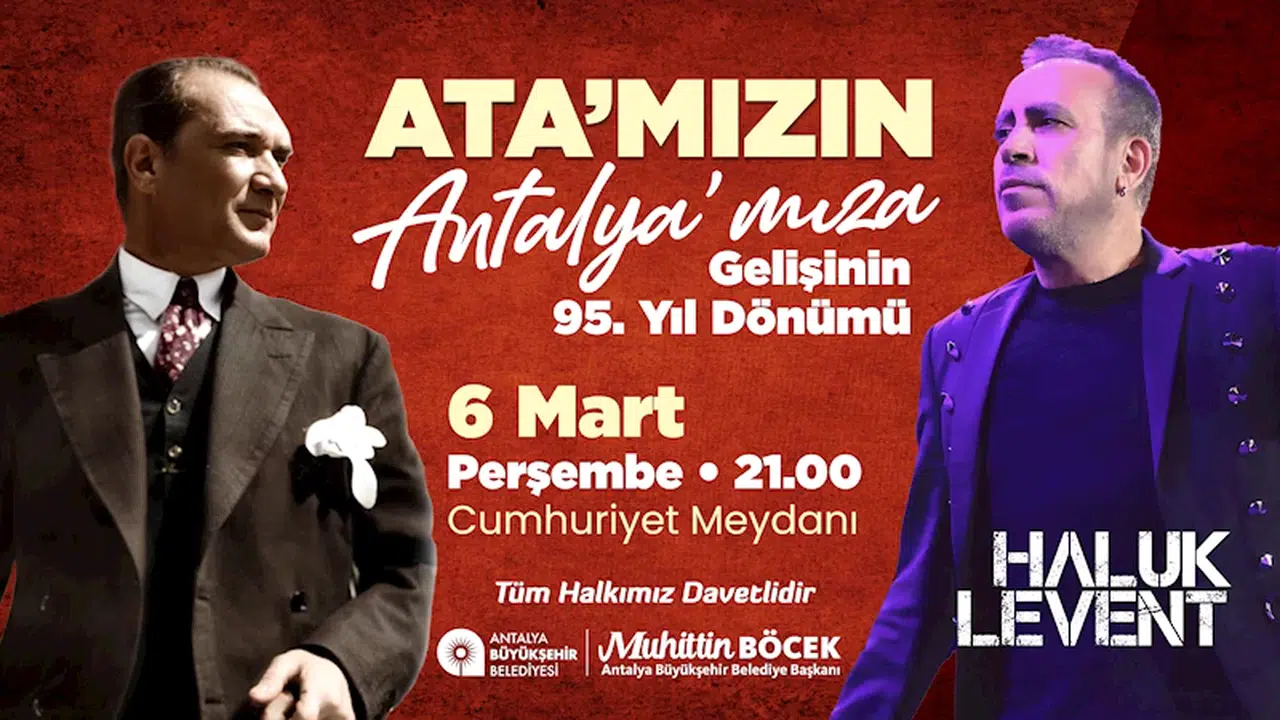 Atatürk'ün6 Mart 1930 tarihinde Antalya ziyaretinin 95. yılıanlamlı etkinliklerle kutlanacak. Antalya Büyükşehir Belediyesi, etkinlikler kapsamında sanatçı Haluk Levent'i halkla buluşturacak. Haluk Levent, 6 Mart Perşembe günü saat 21.00'de Cumhuriyet Meydanı'nda Antalyalılara konser verecek. Haluk Levent, coşkulu şarkılarını Antalyalılar ile birlikte seslendirecek. Büyükşehir Belediye Başkanı Muhittin Böcek, Antalyalıları Haluk Levent konserine ve Atatürk'ün Antalya'ya gelişinin 95'inci yılını coşkuyla kutlamaya davet etti.